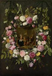 Keywords: 'The Holy Family Surrounded by a Garland of Roses' by Daniel Seghers.jpg en The Holy Family Surrounded by a Garland of Roses by Daniël Seghers Oil on canvas 95 2 x 64 7 cm Hohenbuchau Collection on permanent loan to Liechtenstein The Princely Collections Vienna Hohenbuchau Collection Daniël Seghers Paintings in the Liechtenstein Museum Garland paintings by Daniël Seghers Garland of flowers frame in paintings PD-old-100