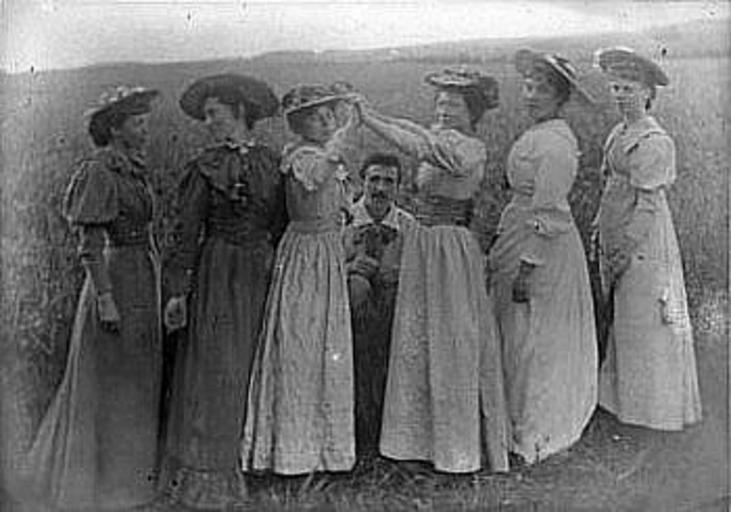 Keywords: The Immortals.jpg The Immortals<br>Glasgow School of Art students at Roaring Camp in Ayreshire Left to right Frances MacDonald Agnes Raeburn Janet Aitken Charles Rennie Mackintosh Katherine Cameron Jessie Keppie and Margaret MacDonald http //birlinn co uk/files/Image/HHandSpicture3 jpg ca 1894 Author photographer died most probably 70 years ago PD-old Glasgow School Frances MacDonald 1894 ca Margaret MacDonald 1894 ca 1890s photographs Charles Rennie Mackintosh 1894