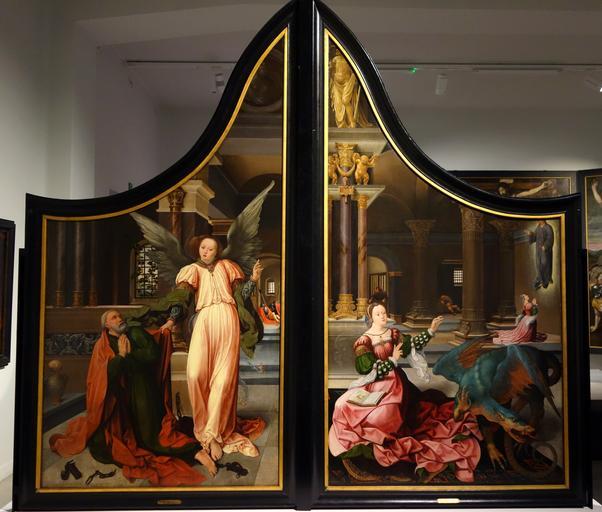 Keywords: The Liberation of Saint Peter (left) and Saint Margaret of Antioch (right), by Jan Rombouts I, c. 1522-1530, view 1 - Museum M - Leuven, Belgium - DSC05093.JPG en Exhibit in the Museum M - Leuven Belgium This artwork is in the public domain because the artist died more than 70 years ago Photography was permitted in the museum without restriction 2013-10-12 07 16 14 own Daderot cc-zero Uploaded with UploadWizard The Liberation of Saint Peter and Saint Margaret of Antioch by Jan Rombouts I |