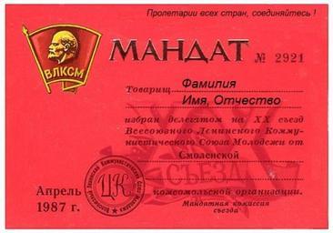 | View Original: | The_mandate_of_delegate_the_all-Union_Congress_Komsomol_USSR,_1987.jpg (500x350) | |||
