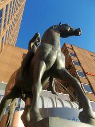 Keywords: sutton surrey sutton, surrey suttonsurrey sutton, london suttonlondon sculpture sir david wynne sirdavidwynne london london borough of sutton londonboroughofsutton reed the quadrant thequadrant horse horse and rider horseandrider 1981 art statue public art publicart tonymonblatportfolio outdoor See Wikipedia article: The Messenger is a statue by the English sculptor David Wynne, OBE of a horse and rider. It was installed in the town centre of Sutton in Greater London, England in 1981. Features: The statue features a horse and rider, created in bronze with very dark patination. It is located directly outside the main entrance to Quadrant House (in the Quadrant), adjacent to Sutton railway station. The horse, with a slightly raised left leg, looks towards the station. The rider, seated bareback, raises his left hand in the air above his head and his right hand to his mouth, as if calling out. It is fully life-size and mounted on a 7 foot plinth of marble and granite slabs. The total height is 150 inches. Commissioning and the brief: The statue was commissioned by the then Business Press International Ltd, and upkeep of the work now falls to Reed Business Information, who occupy Quadrant House. It was a major commission for Wynne, which took four years from his first idea and inspiration on receipt of the brief through roughing out, refining and foundry to the final unveiling and installation. The brief given to him by the company was to illustrate the fundamental business of the company, namely communication, but to convey the idea, rather than simply to represent the work of the company in a direct or very obvious way. Location: The company had initially considered that the work should be installed high up, above the entrance lobby. However, Wynne advised against this, feeling that the distance created would militate against the engagement he wanted people to have with the work. It would be perceived as two-dimensional, depriving people of the full three-dimensions they would feel by walking around it. So the statue was installed at ground level in front of the entrance to the building, enabling people to get close up to it. Moment of inspiration: Having agreed the overall idea that the work was to convey, Wynne had to consider what actual form the sculpture would take to best capture the idea of communication. When inspiration came to him, it did so "like a flash of light, complete", as he put it: "A tall wise horse that had never known a bridle, a magic horse if you like, poised, one foot pointing to the centre of the earth; head up, nostrils flared, about to whip round and plunge away. On his back a carefree boy, wild as the horse, calling out to his friends, who have forgotten that they too are heirs to his kingdom." Preparation: As part of his preparation, Wynne visited Italy to see the Equestrian Statue of Marcus Aurelius in Rome and the Horses of Saint Mark in Venice. Unveiling: Describing his thoughts moments before the unveiling, David Wynne wrote in his 1982 book The Messenger. "It is a proud moment for the sculptor when he sees a crowd of expectant and rather puzzled people gazing at an ungainly shrouded shape in the most prominent position outside a gleaming new building. Will they be surprised, pleased, disappointed or even appalled when the cover comes off? Too late to change it now!" Wynne's idea of the relationship between the horse and man: In his introductory essay in the book The Messenger, Lucius Noël notes Wynne's dislike for statues where the horse is shown as merely the support for the rider. Noël notes the way that Wynne highlights the interrelationship between horse and rider in the work, as he did in his previous two horse and rider sculptures. While noting the greater reality in the work than its two equestrian predecessors, he stresses the strong symbolism in the work. He writes: "The rider, a young man, is giving his message to his audience, and seems to be saying that there is another world that all should know about. But the horse is just as important as the man. His is, in fact, more concious than the man, and has his feet firmly planted on the ground, one hoof pointing to the centre of the earth. They are a team, and the overall impression is that each needs the other: man needs the horse, as much as the horse needs man." Noël notes how this analysis ties in with Wynne's wider views about animals: "We must share the Earth with the animals, who have as much right to it as we do. To find a way to live in peace with the animals is our duty." See Wikipedia article: The Messenger is a statue by the English sculptor David Wynne, OBE of a horse and rider. It was installed in the town centre of Sutton in Greater London, England in 1981. Features: The statue features a horse and rider, created in bronze with very dark patination. It is located directly outside the main entrance to Quadrant House (in the Quadrant), adjacent to Sutton railway station. The horse, with a slightly raised left leg, looks towards the station. The rider, seated bareback, raises his left hand in the air above his head and his right hand to his mouth, as if calling out. It is fully life-size and mounted on a 7 foot plinth of marble and granite slabs. The total height is 150 inches. Commissioning and the brief: The statue was commissioned by the then Business Press International Ltd, and upkeep of the work now falls to Reed Business Information, who occupy Quadrant House. It was a major commission for Wynne, which took four years from his first idea and inspiration on receipt of the brief through roughing out, refining and foundry to the final unveiling and installation. The brief given to him by the company was to illustrate the fundamental business of the company, namely communication, but to convey the idea, rather than simply to represent the work of the company in a direct or very obvious way. Location: The company had initially considered that the work should be installed h