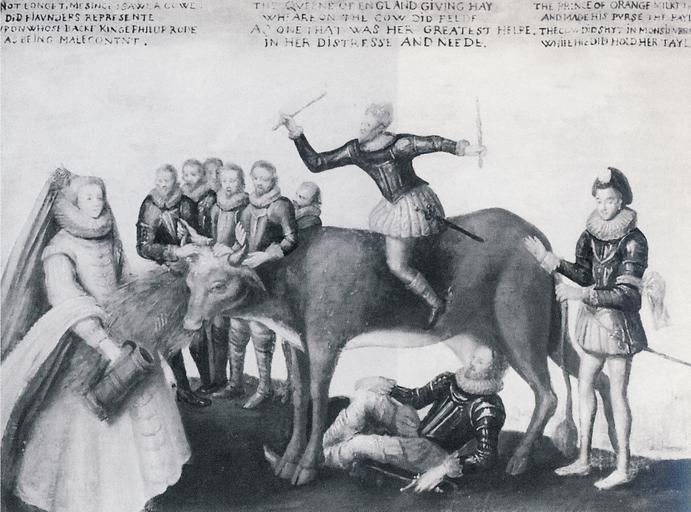 | Keywords: The Milch Cow.png François Duke of Anjou brother of King Henry III of France to Queen Elizabeth's court in 1581 “82 to discuss his marriage proposal and his military support for the Anglo-Dutch alliance against the Spanish Anjou's subsequent mission to the Netherlands met with disaster when his army was massacred by the citizens of Antwerp in early 1583 <br/> <br/>The cartoon depicts a cow which represents the Dutch provinces King Philip II of Spain is vainly trying to ride the cow; Queen Elizabeth is feeding it; William of Orange is milking it; and the cow is defecating on the hand of the Duke of Anjou who is holding its tail <br/> <br/>The caption reads <br/> <br/>Not longe time since I sawe a cowe<br/> Did Flaunders represente<br/> Upon whose backe King Philup rode<br/> As being malecontnt <br/> <br/>The Queene of England giving hay<br/> Wheareon the cow did feede <br/> As one that was her greatest helpe<br/> In her distresse and neede <br/> <br/>The Prince of Orange milkt the cowe<br/> And made his purse the payle <br/> The cow did shyt in Monsieur's hand<br/> While he did hold her tayle <br/> <br/> Reference Mack P Holt The Duke of Anjou and the Politique Struggle During the Wars of Religion Cambridge Cambridge University Press ISBN 0521892783 pp 164 “65 Philip Kamen Philip of Spain New Haven CT Yale University Press 1998 ISBN 0300078005 Artist unknown; English school Uploaded by Qp10qp c 1582 “83 <gallery> File Het melkkoetje artiest onbekend ca 1580-1595 jpg Version from www rijksmuseum nl File Queen Elizabeth I Feeds the Dutch Cow png </gallery> PD-Art 1580s political cartoons Eighty Years' War 1582 Elizabeth I of England William the Silent Philip II of Spain caricatures François Duke of Anjou English paintings in the Rijksmuseum Amsterdam Anonymous |