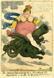 Keywords: The Munchauseness of Herford!!! Mounted on the R-ts Bomb.jpg en The Munchauseness of Herford Mounted on the R-ts Bomb Lady Hertford Isabella Anne Ingram Shepherd 2nd Marchioness of Hertford pictured sitting astride the giant mortar known as the Regent's Bomb She is pictured holding a match and saying I'll set light to the Touch-ole and see if it will give the Bomb any extra motion and should a couple of Balls give a mortal blow to R-d Richmond it will be a lucky Stroke 1819-05 hand-coloured etching credit line Courtesy of the British Museum London British Museum http //www britishmuseum org/research/search_the_collection_database/search_object_details aspx objectid 1486872 partid 1 searchText ingram fromADBC ad toADBC ad titleSubject on numpages 10 images on orig 2fresearch 2fsearch_the_collection_database aspx currentPage 5 other versions PD-old-100 Isabella Marchioness of Hertford Etchings Satire Cádiz Memorial London |