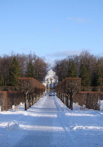Keywords: the palace ensemble tsarskoe selo russia alley palace trees shadow winter road snow