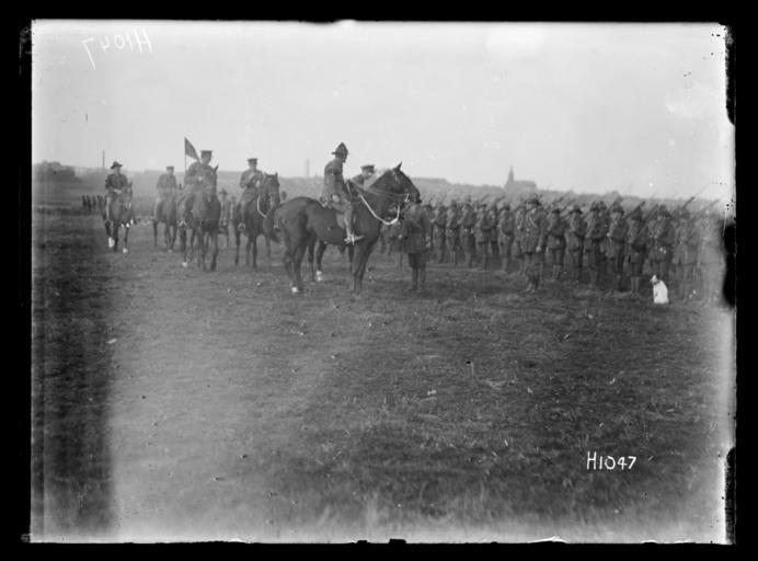 | Keywords: blackandwhite monochrome photo border outdoor black and white A general view of the Prince of Wales visiting New Zealand troops during World War I in Beauvois, France. The Prince on horseback is bending forward to talk to an officer. Soldiers, shouldering arms, stand at attention. Photograph taken 14 October 1918 by Henry Armytage Sanders. Inscriptions: Inscribed - Photographer's title on negative -bottom right: H1047. Quantity: 1 b&w original negative(s). Physical Description: Dry plate glass negative 4 x 5 inches The Prince of Wales visits New Zealand troops, World War I, Beauvois. Royal New Zealand Returned and Services' Association :New Zealand official negatives, World War 1914-1918. Ref: 1/2-013611-G. Alexander Turnbull Library, Wellington, New Zealand. natlib.govt.nz/records/22654635 A general view of the Prince of Wales visiting New Zealand troops during World War I in Beauvois, France. The Prince on horseback is bending forward to talk to an officer. Soldiers, shouldering arms, stand at attention. Photograph taken 14 October 1918 by Henry Armytage Sanders. Inscriptions: Inscribed - Photographer's title on negative -bottom right: H1047. Quantity: 1 b&w original negative(s). Physical Description: Dry plate glass negative 4 x 5 inches The Prince of Wales visits New Zealand troops, World War I, Beauvois. Royal New Zealand Returned and Services' Association :New Zealand official negatives, World War 1914-1918. Ref: 1/2-013611-G. Alexander Turnbull Library, Wellington, New Zealand. natlib.govt.nz/records/22654635 |