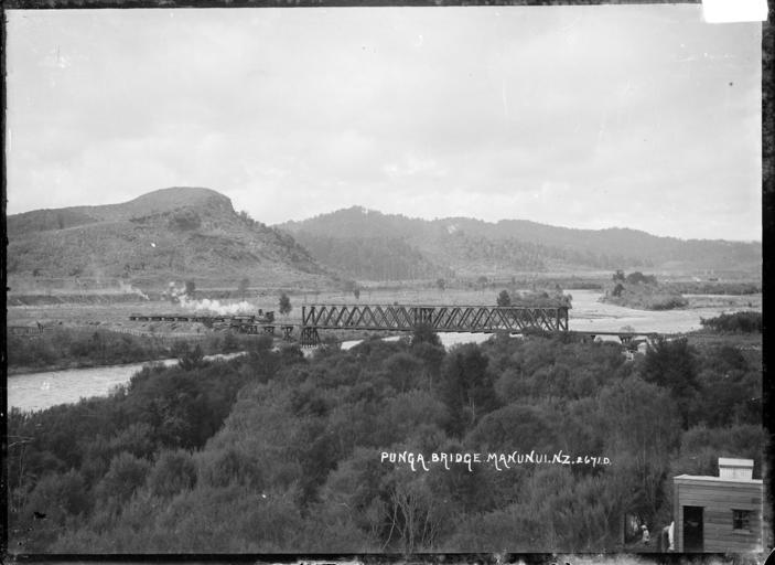 Keywords: blackandwhite monochrome outdoor photo border landscape hill black and white View of the Wanganui River at Manunui, with a logging train on the approach to the Punga Bridge across the river. Photograph taken by William Archer Price. Inscriptions: Inscribed - Photographer's title on negative -bottom right: Punga Bridge. Manunui. NZ. [No.] 2761.D. Quantity: 1 b&w original negative(s). Physical Description: Dry plate glass negative The Punga Bridge (railway bridge) over the Wanganui River, at Manunui. Price, William Archer, 1866-1948 :Collection of post card negatives. Ref: 1/2-000824-G. Alexander Turnbull Library, Wellington, New Zealand. natlib.govt.nz/records/22822682 View of the Wanganui River at Manunui, with a logging train on the approach to the Punga Bridge across the river. Photograph taken by William Archer Price. Inscriptions: Inscribed - Photographer's title on negative -bottom right: Punga Bridge. Manunui. NZ. [No.] 2761.D. Quantity: 1 b&w original negative(s). Physical Description: Dry plate glass negative The Punga Bridge (railway bridge) over the Wanganui River, at Manunui. Price, William Archer, 1866-1948 :Collection of post card negatives. Ref: 1/2-000824-G. Alexander Turnbull Library, Wellington, New Zealand. natlib.govt.nz/records/22822682 |