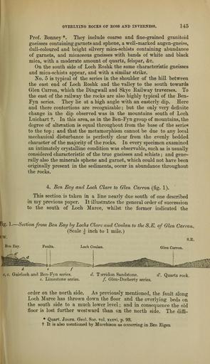 | Keywords: The Quarterly journal of the Geological Society of London (13204753543).jpg OVERLYING ROCKS OF ROSS AND INVERNESS <br> 145 <br> Prof Bonney They include coarse and fine-grained granitoid <br> gneisses containing garnets and sphene a well-marked augen-gneiss <br> dull-coloured and bright silvery mica-schists containing abundance <br> of garnets and micaceous gneisses with bands of white and black <br> mica with a moderate amount of quartz felspar c <br> On the south side of Loch Eoshk the same characteristic gneisses <br> and mica-schists appear and with a similar strike <br> No 5 is typical of the series in the shoulder of the hill between <br> the east end of Loch Eoshk and the valley to the south towards <br> Glen Carron which the Dingwall and Skye Railway traverses To <br> the east of the railway the rocks are also highly typical of the Ben- <br> Fyn series They lie at a high angle with an easterly dip Here <br> and there contortions are recognizable ; but the only very definite <br> change in the dip observed was in the mountains south of Loch <br> Luichart f In this area as in the Ben-Fyn group of mountains the <br> degree of alteration is equal throughout from the base of the series <br> to the top ; and that the metamorphism cannot be due to any local <br> mechanical disturbance is perfectly clear from the evenly bedded <br> character of the majority of the rocks In every specimen examined <br> an intimately crystalline condition was observable such as is usually <br> considered characteristic of the true gneisses and schists ; and gene- <br> rally also the minerals sphene and garnet which could not have been <br> originally present in the sediments occur in abundance throughout <br> the rocks <br> 4 Ben Eay and Loch Clare to Glen Carron fig 1 <br> This section is taken in a line nearly due south of one described <br> in my previous paper It illustrates the general order of succession <br> to the south of Loch Maree whilst the former indicated the <br> Kg 1 ” Section from Ben Eay by Lochs Clare and Coulan to the S E of Glen Cai <br> Scale inch to 1 mile <br> r w <br> S E <br> Faults <br> Loch Coulan <br> Glen Carron <br> c c Gairloch and Ben-Fyn series <br> e Limestone series <br> d Torridon Sandstone d\ Quartz rock <br> / Glen-Docherty series <br> order on the north side As previously mentioned the fault along <br> Loch Maree has thrown down the floor and the overlying beds on <br> the south side to a much lower level ; and in consequence the old <br> floor is lost further westward than on the north side The diffi- <br> Quart Journ Geol Soc vol xxxvi p 03 <br> t It is also mentioned by Murchison as occurring in Ben Eigen 36928730 113681 51125 Page 145 Text 39 http //www biodiversitylibrary org/page/36928730 1883 Geological Society of London Biodiversity Heritage Library The Quarterly journal of the Geological Society of London v 39 1883 Geology Periodicals Smithsonian Libraries bhl page 36928730 dc identifier http //biodiversitylibrary org/page/36928730 smithsonian libraries Information field Flickr posted date ISOdate 2014-03-16 Check categories 2015 August 26 CC-BY-2 0 BioDivLibrary https //flickr com/photos/61021753 N02/13204753543 2015-08-26 13 51 44 cc-by-2 0 PD-old-70-1923 The Quarterly journal of the Geological Society of London 1883 Photos uploaded from Flickr by Fæ using a script |