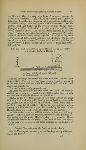 Keywords: The Quarterly journal of the Geological Society of London (13204863944).jpg NORTH-WEST OF ENGLAND AND NORTH AVALES 101 <br> the Dee and Alyiij is a very high bank of shingle None of the <br> stones were scratched They consist of Silurian grits Mountain <br> Limestone felspathic and trappean rocks greenstone small pebbles <br> of granite cherty limestone syenite and Millstone Grit On the <br> opposite bank and higher up the river a landslip August 1873 <br> displayed stratified sand with thin bands of gravel and in some <br> places fragments of coal At one point there appeared to be seams <br> of peat ; but an examination showed they were composed of rounded <br> pieces of coal-shale closely packed together I picked up fragments <br> of Cardium and Tellina ; but they were not plentiful On the east <br> side of the railway between Wrexham and Gresford is a ballast-pit <br> fig 20 showing gravel shingle and boulders c lying upon strati- <br> fied sand d <br> Fig 20 ” Section in Ballast-pit on the east side of the Valley <br> between Gresford and Wrexham <br> r <br> i <br> c Gravel and shingle mixed with sand <br> d Stratified sand <br> The bed of shingle and gravel was mixed with sand and was about <br> 25 feet high There were some large granite boulders among it <br> mixed with stones common to the Lancashire drift and with local <br> stones and coal-shales <br> The local stones greatly preponderated <br> At Chirk we come upon the Dee again and from the railway <br> viaduct can be seen a very great depth of half-rounded shingle which <br> has been cut into by the river on its right bank <br> Higher up the river than Llangollen and about Cor wen are great <br> hills of gravel and sand drift showing curved bedding ; these beds <br> are cut into cliffs on either side of the valley Near Carrog station <br> the drift is very full of boulders At Cynwyd station there is a deep <br> cutting in a buff-coloured clayey drift containing boulders Near <br> Llandillo there is a good section of bedded sand and gravel <br> At Bala station there is a drift of angular subangular and slaty <br> shingle Between Bala and Dolgelly massive rounded boulders are <br> seen resting upon the rock Here are also gravel mounds There <br> are immense boulders in the gravel The shores of Bala Lake by the <br> railway show gravel shingle and large boulders in the shallows of <br> the lake <br> General Observations on the Drifts of the Dee Basin <br> The Boulder-clay of the estuary of the Dee is generally similar to <br> that of the Mersey <br> i2 36928682 113681 51125 Page 101 Text 39 http //www biodiversitylibrary org/page/36928682 1883 Geological Society of London NameFound Avales NameFound Cardium NameConfirmed Cardium EOLID 50301 NameBankID 2693257 NameFound None NameConfirmed None EOLID 2913255 NameFound Tellina NameConfirmed Tellina EOLID 50297 NameBankID 2693370 Biodiversity Heritage Library The Quarterly journal of the Geological Society of London v 39 1883 Geology Periodicals Smithsonian Libraries bhl page 36928682 dc identifier http //biodiversitylibrary org/page/36928682 smithsonian libraries Information field Flickr posted date ISOdate 2014-03-16 Check categories 2015 August 26 CC-BY-2 0 BioDivLibrary https //flickr com/photos/61021753 N02/13204863944 2015-08-26 13 51 47 cc-by-2 0 PD-old-70-1923 The Quarterly journal of the Geological Society of London 1883 Photos uploaded from Flickr by Fæ using a script