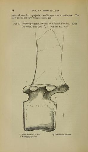 Keywords: The Quarterly journal of the Geological Society of London (13204805734).jpg 58 <br> PKOF H G SEELEY ON A NEW <br> external to which it projects laterally more than a centimetre The <br> facet is still concave with a central pit <br> Fig 2 ” Sphenospondylus left side of a Dorsal Vertebra Pox <br> Collection Brit Mus One half nat size <br> b Facet for head of rib <br> z Postzygapophysis <br> tp Tranverse process 36928635 113681 51125 Page 58 Text 39 http //www biodiversitylibrary org/page/36928635 1883 Geological Society of London NameFound Sphenospondylus NameConfirmed Sphenospondylus NameBankID 4348469 Biodiversity Heritage Library The Quarterly journal of the Geological Society of London v 39 1883 Geology Periodicals Smithsonian Libraries bhl page 36928635 dc identifier http //biodiversitylibrary org/page/36928635 smithsonian libraries Information field Flickr posted date ISOdate 2014-03-16 Check categories 2015 August 26 CC-BY-2 0 BioDivLibrary https //flickr com/photos/61021753 N02/13204805734 2015-08-26 13 52 27 cc-by-2 0 PD-old-70-1923 The Quarterly journal of the Geological Society of London 1883 Photos uploaded from Flickr by Fæ using a script |