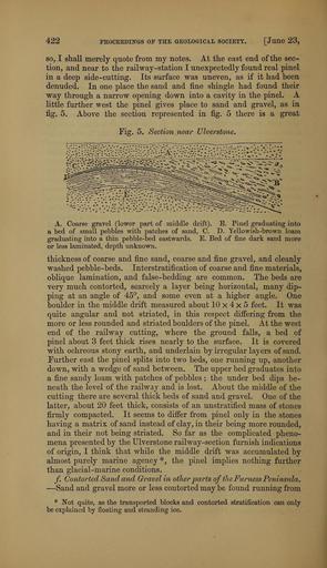 | Keywords: The Quarterly journal of the Geological Society of London (12961399163).jpg 422 <br> PKOCEEDINGS OF THE GEOLOGICAL SOCIETY June 23 <br> SO I shall merely quote from my notes At the east end of the sec- <br> tion and near to the railway- station I unexpectedly found real pinel <br> in a deep side -cutting Its surface was uneven as if it had been <br> denuded In one place the sand and fine shingle had found their <br> way through a narrow opening down into a cavity in the pinel A <br> little further west the pinel gives place to sand and gravel as in <br> Above the section represented in fig 5 there is a <br> 5 <br> great <br> Fig 5 Section near Ulver stone <br> A Coarse gravel lower part of middle drift B Pinel graduating into <br> a bed of small pebbles with patches of sand C D Yellowish-brown loam <br> graduating into a thin pebble-bed eastwards E Bed of fine dark sand more <br> or less laminated depth unknown <br> thickness of coarse and fine sand coarse and fine gravel and cleanly <br> washed pebble-beds Interstratification of coarse and fine materials <br> oblique lamination and false-bedding are common The beds are <br> very much contorted scarcely a layer being horizontal many dip- <br> ping at an angle of 45° and some even at a higher angle One <br> boulder in the middle drift measured about 10 x 4 x 5 feet It was <br> quite angular and not striated in this respect differing from the <br> more or less rounded and striated boulders of the pinel At the west <br> end of the railway cutting where the ground falls a bed of <br> pinel about 3 feet thick rises nearly to the surface It is covered <br> with ochreous stony earth and underlain by irregular layers of sand <br> Further east the pinel splits into two beds one running up another <br> down with a wedge of sand between The upper bed graduates into <br> a fine sandy loam with patches of pebbles ;- the under bed dips be- <br> neath the level of the railway and is lost About the middle of the <br> cutting there are several thick beds of sand and gravel One of the <br> latter about 20 feet thick consists of an unstratified mass of stones <br> firmly compacted It seems to differ from pinel only in the stones <br> having a matrix of sand instead of clay in their being more rounded <br> and in their not being striated So far as the complicated pheno- <br> mena presented by the Ulverstone railway-section furnish indications <br> of origin I think that while the middle drift was accumulated by <br> almost purely marine agency the pinel implies nothing further <br> than glacial-marine conditions <br> / Contorted Sand and Gravel in other parts of the Furness Peninsula <br> ” Sand and gravel more or less contorted may be found running from <br> Not quite as the transported blocks and contorted stratification can only <br> be explained by floating and stranding ice 36103297 111288 51125 Page 422 Text v 25 http //www biodiversitylibrary org/page/36103297 1869 Geological Society of London Biodiversity Heritage Library The Quarterly journal of the Geological Society of London v 25 1869 Geology Periodicals Smithsonian Libraries bhl page 36103297 dc identifier http //biodiversitylibrary org/page/36103297 smithsonian libraries Information field Flickr posted date ISOdate 2014-03-06 Check categories 2015 August 26 CC-BY-2 0 BioDivLibrary https //flickr com/photos/61021753 N02/12961399163 2015-08-26 14 52 35 cc-by-2 0 PD-old-70-1923 The Quarterly journal of the Geological Society of London 1869 Photos uploaded from Flickr by Fæ using a script |