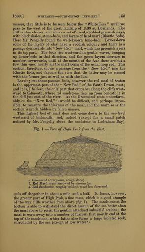 | Keywords: The Quarterly journal of the Geological Society of London (12961266163).jpg 1869 <br> WfllTAKER SOUTH-DEVON ' NEW RED <br> 153 <br> masses that little is to be seen below the White Lias until we <br> pass to the west of the great landslip of 1839 at Dowlands The <br> cliff is then clearer and shows a set of evenly-bedded greenish clays <br> with black shales stone-beds and layers of hard marl Rhsetic Beds <br> Here Mr Pengelly found the well-known bone-bed Lower down <br> some of the layers of clay have a reddish colour ; and there is a <br> passage downwards into New Red marl which has greenish layers <br> in its top part The beds rise westward in gentle waves bringing <br> up lower beds in that direction and the green layers decrease in <br> number downwards until at the mouth of the Axe there are but a <br> few thin ones nearly all the marl being of the usual deep red This <br> section therefore shows a passage from the New Eed into the <br> Bhsetic Beds and favours the view that the latter may be classed <br> with the former just as well as with the Lias <br> Leaving out these passage-beds however the red marl of Seaton <br> is the uppermost part of the New Red of the South Devon coast ; <br> and it is I believe the only part that crops out along the cliffs west- <br> ward to Sidmouth where red sandstone rises up from beneath it in <br> the cliff just east of the river As the Greensand rests unconform- <br> ably on the New Red it would be difficult and perhaps impos- <br> sible to measure the thickness of the marl and the more so as the <br> section is much hidden by fallen masses <br> This highest bed of marl does not come down to the sea-level <br> westward of Sidmouth and indeed except for a small patch <br> noticed by Mr Pengelly above the sandstone in Ladraham Bay <br> Fig 1 ” View of High Peak from the East <br> 7y <br> h Grreensand overgrown j-ough slope <br> 2 E ed Marl much fui'rowed by streams c <br> 3 Eed Sandstone roughly bedded much less furrowed <br> ends off altogether in about a mile and a half It forms however <br> the greater part of High Peak a fine mass which is a good example <br> of the way cliffs weather from above fig 1 The sandstone at the <br> bottom is able to withstand the direct assault of the sea better than <br> the marl above to resist the gentler attacks of subaerial actions ; the <br> marl is worn away into a number of furrows that mostly end at the <br> top of the sandstone which latter also forms a large isolated rock <br> surrounded by the sea except at low water 36102998 111288 51125 Page 153 Text v 25 http //www biodiversitylibrary org/page/36102998 1869 Geological Society of London Biodiversity Heritage Library The Quarterly journal of the Geological Society of London v 25 1869 Geology Periodicals Smithsonian Libraries bhl page 36102998 dc identifier http //biodiversitylibrary org/page/36102998 smithsonian libraries Information field Flickr posted date ISOdate 2014-03-06 Check categories 2015 August 26 CC-BY-2 0 BioDivLibrary https //flickr com/photos/61021753 N02/12961266163 2015-08-26 15 54 06 cc-by-2 0 PD-old-70-1923 The Quarterly journal of the Geological Society of London 1869 Photos uploaded from Flickr by Fæ using a script |