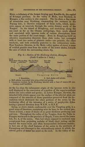 | Keywords: The Quarterly journal of the Geological Society of London (12961101575).jpg s form <br> the main portion of the coast-range Even in Hongkong itself an <br> attentive examination discovers these slate rocks but entangled <br> with at least two series of plutonic rocks ” one granitic the other <br> trachytic and both evidently posterior to the sedimentary rocks <br> Near Soochow likewise in the Modo valley spoken of above a mass <br> of reddish granite rises from the midst of the lower shales towards <br> the axis of which the surrounding strata dip <br> Pig 2 - <br> S S E <br> White Deer Wu-lao-feng The Lu-Shan <br> Grotto ž 4 500feet\ 5040 feet <br> Section of the Kiuhiang district Kiangsu <br> Scale 6 miles to 1 inch <br> Tien Chi <br> Pagoda <br> N N W <br> Fossils <br> Granite <br> Tungting G-rits <br> Lime- <br> stones <br> 1 Quartzites 2 Soft shales and schists <br> a Soft schists converted into mica-schist and gneiss <br> b Limestone overlain by the Kiukiang laterite with a base of coarse till con- <br> taining small boulders <br> At the Lu-shan the subsequent origin of the igneous rocks is also <br> well displayed in the conversion of a portion of the superincumbent <br> shales into mica-schist and gneiss ; in Lower Kiangsu likewise the <br> detached hills which appear over the surface of the alluvial plain are <br> composed of the remains of these quartzites preserved from the de- <br> nudation which destroyed the other portions of the series by the <br> hardening effect of the intrusion of a series of porphyritic dykes <br> having a general direction from W S W to E N E <br> Lying as above stated conformably over the Tungting grits is a <br> great mass of limestone containing near its base in the central pro- <br> vinces at least a mass of shales of no great thickness producing coal <br> and iron Throughout the valley of the Yangtse from the Taihu in <br> Kiangsu westwards to the province of Hupeh I have traced the lower <br> bed No 4 of the series This bed where exposed is rendered very <br> conspicuous from projecting nodules of black chert jutting out far <br> beyond the water-worn and often honeycombed limestone matrix ; <br> in fact one of the chief features of the series in the provinces of <br> Kwangtung and Kwangsi is the extraordinary extent to which the <br> solvent power of water has acted on the rock In the valley of the 36102967 111288 51125 Page 122 Text v 25 http //www biodiversitylibrary org/page/36102967 1869 Geological Society of London Biodiversity Heritage Library The Quarterly journal of the Geological Society of London v 25 1869 Geology Periodicals Smithsonian Libraries bhl page 36102967 dc identifier http //biodiversitylibrary org/page/36102967 smithsonian libraries Information field Flickr posted date ISOdate 2014-03-06 Check categories 2015 August 26 CC-BY-2 0 BioDivLibrary https //flickr com/photos/61021753 N02/12961101575 2015-08-26 15 52 54 cc-by-2 0 PD-old-70-1923 The Quarterly journal of the Geological Society of London 1869 Photos uploaded from Flickr by Fæ using a script |