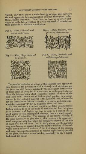 | Keywords: The Quarterly journal of the Geological Society of London (12960393233).jpg ANNIVEESAEY ADDEESS OF THE PEESIDEl T <br> 73 <br> Tarbet; only they are on a scale about - \ as large and therefore <br> the rock appears to have an imperfect cleavage throughout rather <br> than a iointed structure Here then we have an imperfect clea- <br> vage due to the lateral yielding of a rock composed of material not <br> truly plastic in its ultimate constitution <br> Fig 3 Slate Liskeard with <br> minute contortions <br> Fig 4 Slate LisJceard with <br> planes of discontinuity <br> Pig 5 Slate Shap disturbed <br> Yig 6 Slate Llanheris with <br> well-c <br> The peculiar laminated structure of this Liskeard slate appears to <br> have favoured the production of this close-jointed structure and <br> the joints are still further marked by the subsequent introduction <br> of black oxide of iron ; but in some cases as in the pencil-slate of <br> Shap the flakes of mica which constitute nearly the whole of the <br> rock have been thrown out of their original position in a similar <br> manner to the contorted material of the Liskeard slate often with- <br> out the formation of definite contortions or joints as shown some- <br> what diagramaticaUy by fig 5 magnified about 200 linear <br> We thus arrive at a structure in which the flakes in each minute <br> broken portion do lie in the plane of stratification but this plane <br> is so contorted and broken up that as seen in a section cut at <br> right angles to both bedding and cleavage they are nearly equally <br> inclined at all azimuths The amount of the lateral yielding of <br> the mass necessary to give rise to this structure is apparently <br> small compared with that which has certainly occurred in the case <br> of many well-cleaved slates ; but it clearly shows how the particles <br> may soon become so arranged that the further yielding of the rock <br> would totally efface all evidence of the first stages of the process <br> and cause the constituent laminse to become approximately parallel <br> to one plane as shown somewhat diagramaticaUy by fig 6 magni- <br> fied about 200 linear 36091160 111264 51125 Page 73 Text 36 http //www biodiversitylibrary org/page/36091160 1880 Geological Society of London Biodiversity Heritage Library The Quarterly journal of the Geological Society of London v 36 1880 Geology Periodicals Smithsonian Libraries bhl page 36091160 dc identifier http //biodiversitylibrary org/page/36091160 smithsonian libraries Information field Flickr posted date ISOdate 2014-03-06 Check categories 2015 August 26 CC-BY-2 0 BioDivLibrary https //flickr com/photos/61021753 N02/12960393233 2015-08-26 15 54 03 cc-by-2 0 PD-old-70-1923 The Quarterly journal of the Geological Society of London 1880 Photos uploaded from Flickr by FĂŚ using a script |