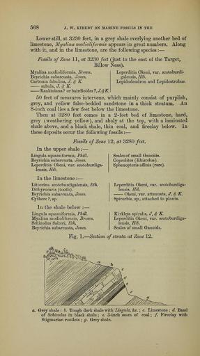 Keywords: The Quarterly journal of the Geological Society of London (12960632114).jpg 568 <br> J W KIEKBY ON MAEINE FOSSILS IN THE <br> Lower still at 3230 feet in a grey shale overlying another bed of <br> limestone Myalina modioUformis appears in great numbers Along <br> with it and in the limestone are the following species ” <br> Fossils of Zone 11 a 3230 feet just to the east of the Target <br> Billow Ness <br> Leperditia Okeni var scotoburdi- <br> galensis Hih <br> Lepidodendron and Lepidostrobus <br> Myalina modioliformis Brown <br> Beyrichia subarcuata Jones <br> Carbonia fabulina J K <br> subula J K <br> Eankiniana or bairdioides J S K <br> 50 feet of measures intervene which mainly consist of purplish <br> grey and yellow false-bedded sandstone in a thick stratum An <br> 8-inch coal lies a few feet below the limestone <br> Then at 3280 feet comes in a 2-feet bed of limestone hard <br> grey weathering yellow and shaly at the top with a laminated <br> shale above and a black shale thin coal and fireclay below In <br> these deposits occur the following fossils ” <br> Fossils of Zone 12 at 3280 feet <br> In the upper shale ” <br> Lingula squamiformis Fhill <br> Beyrichia subarcuata Jones <br> Leperditia Okeni var scotoburdiga- <br> lensis Hih <br> Scales of small G-anoids <br> Ooprolites Ehizodus <br> Sphenopteris affinis rare <br> In the limestone ” <br> Littorina scotoburdigalensis Eth <br> Dithyrocaris tooth <br> Beyrichia subarcuata Jones <br> Oythere sp <br> In the shale below ” <br> Lingula squamiformis Fhill <br> Myalina modioliformis Brown <br> Schizodus Salteri Eth <br> Beyrichia subarcuata Jones <br> Leperditia Okeni var scotoburdiga- <br> lensis Hih <br> Okeni var attenuata J K <br> Spirorbis sp attached to plants <br> Kirkbya spiralis J K <br> Leperditia Okeni var scotoburdiga- <br> lensis Hih <br> Scales of small Ganoids <br> Fig 1 ” Section of strata at Zone 12 <br> «Av <br> a Grey shale ; h Tough dark shale with Lingula c ; c Limestone ; d Band <br> of Bchizodus in black shale ; e 3-incb seam of coal ; f Fireclay with <br> Stigmarian rootlets ; g Grey shale 36090963 111264 51125 Page 568 Text 36 http //www biodiversitylibrary org/page/36090963 1880 Geological Society of London NameFound Beyrichia subarcuata NameConfirmed Beyrichia subornata NameFound Carbonia NameConfirmed Carbonia NameBankID 4103510 NameFound Dithyrocaris NameConfirmed Dithyrocaris NameBankID 4147125 NameFound Kirkbya spiralis NameConfirmed Kirkbya spiralis NameFound Leperditia NameConfirmed Leperditia EOLID 13110263 NameBankID 4217023 NameFound Lepidodendron NameConfirmed Lepidodendron EOLID 13132167 NameBankID 4921583 NameFound Lepidostrobus NameConfirmed Lepidostrobus EOLID 13132170 NameBankID 4853067 NameFound Lingula NameConfirmed Lingula EOLID 11118945 NameBankID 2765654 NameFound Lingula squamiformis NameConfirmed Lingula squamiformis NameBankID 6117793 NameFound Littorina NameConfirmed Littorina EOLID 10715162 NameBankID 2683230 NameFound Myalina NameConfirmed Myalina NameBankID 4249388 NameFound Myalina modioliformis NameConfirmed Chalina moniliformis Carter 1885 EOLID 1163650 NameFound Okeni var attenuata NameFound Okeni var scotoburdi NameFound Okeni var scotoburdiga NameFound Schizodus NameConfirmed Schizodus NameBankID 4334356 NameFound Sphenopteris affinis NameFound Spirorbis NameConfirmed Spirorbis EOLID 11141041 NameBankID 2552082 NameFound Spirorbis sp NameConfirmed Spirorbis EOLID 11141041 NameBankID 2552082 Biodiversity Heritage Library The Quarterly journal of the Geological Society of London v 36 1880 Geology Periodicals Smithsonian Libraries bhl page 36090963 dc identifier http //biodiversitylibrary org/page/36090963 smithsonian libraries Information field Flickr posted date ISOdate 2014-03-06 Check categories 2015 August 26 CC-BY-2 0 BioDivLibrary https //flickr com/photos/61021753 N02/12960632114 2015-08-26 15 57 45 cc-by-2 0 PD-old-70-1923 The Quarterly journal of the Geological Society of London 1880 Photos uploaded from Flickr by Fæ using a script |