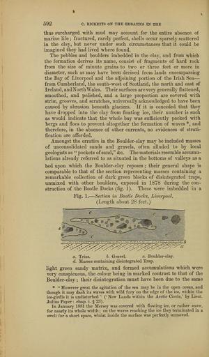 | Keywords: The Quarterly journal of the Geological Society of London (14076960164).jpg 592 <br> C RICKETTS ON THE ERKATICS IN THE <br> thus surcharged -with mud may account for the entire absence of <br> marine life ; fractured rarely perfect shells occur sparsely scattered <br> in the clay but neyer under such circumstances that it could be <br> imagined they had lived where found <br> The pebbles and boulders imbedded in the clay and from which <br> the formation derives its name consist of fragments of hard rock <br> from the size of minute grains to two or three feet or more in <br> diameter such as may have been derived from lands encompassing <br> the Bay of Liverpool and the adjoining portion of the Irish Sea ” <br> from Cumberland the south-west of Scotland the north and east of <br> Ireland and K'orth ales Their surfaces are very generally flattened <br> smoothed and polished and a large proportion are covered with <br> striae grooves and scratches universally acknowledged to have been <br> caused by abrasion beneath glaciers If it is conceded that they <br> have dropped into the clay from floating ice their number is such <br> as would indicate that the whole bay was sufiiciently packed with <br> bergs and floes to prevent altogether the formation of waves and <br> therefore in the absence of other currents no evidences of strati- <br> fication are afforded <br> Amongst the erratics in the Boulder-clay may be included masses <br> of unconsolidated sands and gravels often alluded to by local <br> geologists as pockets of sand c The materials resemble accumu- <br> lations already referred to as situated in the bottoms of valleys as a <br> bed upon which the Boulder-clay reposes ; their general shape is <br> comparable to that of the section representing masses containing a <br> remarkable collection of dark green blocks of disintegrated traps <br> unmixed with other boulders exposed in 1878 during the con- <br> struction of the Bootle Docks fig 1 These were imbedded in a <br> Pig 1 ” Section in Bootle Docks Liverpool <br> Length aboat 28 feet <br> a Trias h Gravel c Boulder-clay <br> d Masses containing disintegrated Trap <br> light green sandy matrix and formed accumulations which were <br> very conspicuous the colour being in marked contrast to that of the <br> Boulder-clay ; their disintegration must have been due to the same <br> However great the agitation of the sea may be in the open ocean and <br> though it may dash its waves with wild fury on the edge of the ice within the <br> ice-girdle it is undisturbed 'New Lands within the Arctic Circle ' by Lieut <br> Julius Payer chap i § 23 <br> In January 1881 the Mersey was covered with floating ice or rather snow <br> for nearly its whole width ; on the waves reaching the ice they terminated in a <br> swell for a short space whilst inside the surface was perfectly unmoved 37047472 114009 51125 Page 592 Text 41 http //www biodiversitylibrary org/page/37047472 1885 Geological Society of London NameFound Julius NameConfirmed Julius NameBankID 4209283 Biodiversity Heritage Library The Quarterly journal of the Geological Society of London v 41 1885 Geology Periodicals Smithsonian Libraries bhl page 37047472 dc identifier http //biodiversitylibrary org/page/37047472 smithsonian libraries Information field Flickr posted date ISOdate 2014-04-30 Check categories 2015 August 26 CC-BY-2 0 BioDivLibrary https //flickr com/photos/61021753 N02/14076960164 2015-08-26 04 59 01 cc-by-2 0 PD-old-70-1923 The Quarterly journal of the Geological Society of London 1885 Photos uploaded from Flickr by Fæ using a script |