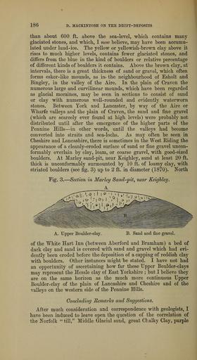 | Keywords: The Quarterly journal of the Geological Society of London (12960478824).jpg 186 D MACKINTOSH ON THE DEIFT-DEPOSITS <br> than about 600 ft above the sea-level which contains many- <br> glaciated stones and which I noiu believe may have been accumu- <br> lated under land-ice The yellow or yellowish-brown clay above it <br> rises to much higher levels contains fewer glaciated stones and <br> differs from the blue in the kind of boulders or relative percentage <br> of different kinds of boulders it contains Above the brown clay at <br> intervals there is a great thickness of sand or gravel which often <br> forms esker-like mounds as in« the neighbourhood of Esholt and <br> Bingley in the valley of the Aire In the plain of Craven the <br> numerous large and curvilinear mounds which have been regarded <br> as glacial moraines may be seen in sections to consist of sand <br> or clay with numerous well-rounded and evidently waterworn <br> stones Between York and Lancaster by way of the Aire or <br> Wharfe valleys and the plain of Craven the sand and fine gravel <br> which are scarcely ever found at high levels were probably not <br> distributed until after the emergence of the higher parts of the <br> Pennine Hills- in other words until the valleys had become <br> converted into straits and sea-lochs As may often be seen in <br> Cheshire and Lancashire there is sometimes in the West Riding the <br> appearance of a cleanly-eroded surface of sand or fine gravel uncon- <br> formably overlain by clay loam or coarse gravel with good-sized <br> boulders At Marley sand-pit near Keighley sand at least 20 ft <br> thick is unconformably surmounted by 10 ft of loamy clay with <br> striated boulders see fig 3 up to 2 ft in diameter 1870 North <br> Fig 3 ” Section in Marley Sand-pit near Keighley <br> A <br> A Upper Boulder-clay B Sand and fine gravel <br> of the White Hart Inn between Aberford and Bramham a bed of <br> dark clay and sand is covered with sand and gravel which had evi- <br> dently been eroded before the deposition of a capping of reddish clay <br> with boulders Other instances might be stated I have not had <br> an opportunity of ascertaining how far these Upper Boulder-clays <br> may represent the Hessle clay of East Yorkshire ; but I believe they <br> are on the same horizon as the much more continuous Upper <br> Boulder- clay of the plain of Lancashire and Cheshire and of the <br> valleys on the western side of the Pennine Hills <br> Concluding RemarJcs and Suggestions <br> After much consideration and correspondence with geologists I <br> have been induced to leave open the question of the correlation of <br> the Norfolk till Middle Glacial sand great Chalky Clay purple 36090529 111264 51125 Page 186 Text 36 http //www biodiversitylibrary org/page/36090529 1880 Geological Society of London Biodiversity Heritage Library The Quarterly journal of the Geological Society of London v 36 1880 Geology Periodicals Smithsonian Libraries bhl page 36090529 dc identifier http //biodiversitylibrary org/page/36090529 smithsonian libraries Information field Flickr posted date ISOdate 2014-03-06 Check categories 2015 August 26 CC-BY-2 0 BioDivLibrary https //flickr com/photos/61021753 N02/12960478824 2015-08-26 16 56 10 cc-by-2 0 PD-old-70-1923 The Quarterly journal of the Geological Society of London 1880 Photos uploaded from Flickr by Fæ using a script |