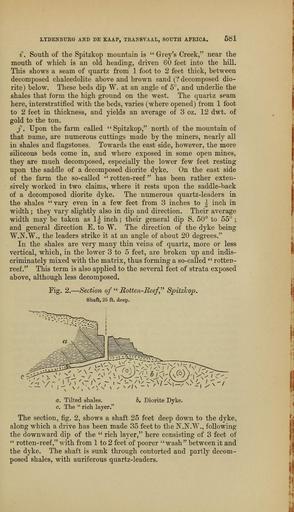 | Keywords: The Quarterly journal of the Geological Society of London (13889856569).jpg  ITDENBUEG AND DE KAAP TEA SyAAL SOUTH AFEICA <br> 581 <br> i' South of the Spitzkop mountain is Grey's Creek near the <br> mouth of which is an old heading driven 60 feet into the hill <br> This shows a seam of quartz from 1 foot to 2 feet thick between <br> decomposed chalcedolite above and brown sand decomposed dio- <br> rite below These beds dip W at an angle of 5 and underhe the <br> shales that form the high ground on the west The quartz seam <br> here interstratified with the beds varies where opened from 1 foot <br> to 2 feet in thickness and yields an average of 3 oz 12 dwt of <br> gold to the ton <br> j' Upon the farm called Spitzkop north of the mountain of <br> that name are numerous cuttings made by the miners nearly all <br> in shales and flagstones Towards the east side however the more <br> sihceous beds come in and where exposed in some open mines <br> they are much decomposed especially the lower few feet resting <br> upon the saddle of a decomposed diorite dyke On the east side <br> of the farm the so-called rotten-reef has been rather exten- <br> sively worked in two claims where it rests upon the saddle-back <br> of a decomposed diorite dyke The numerous quartz-leaders in <br> the shales vary even in a few feet from 3 inches to inch in <br> width ; they vary slightly also in dip and direction Their average <br> width may be taken as 1 inch their general dip S 50° to 55° ; <br> and general direction E to W The direction of the dyke being <br> W N W the leaders strike it at an angle of about 20 degrees <br> In the shales are very many thin veins of quartz more or less <br> vertical which in the lower 3 to 5 feet are broken up and indis- <br> criminately mixed with the matrix thus forming a so-called rotten- <br> reef This term is also applied to the several feet of strata exposed <br> above although less decomposed <br> Pig 2 ” Section of Rotten-Reef Sjpitzko <br> Shaft 25 ft deep <br> a Tilted shales h Diorite Dyke <br> c The rich layer <br> The section fig 2 shows a shaft 25 feet deep down to the dyke <br> along which a drive has been made 35 feet to the jN' jN' AV following <br> the downward dip of the rich layer here consisting of 3 feet of <br> rotten-reef with from 1 to 2 feet of poorer wash between it and <br> the dyke The shaft is sunk through contorted and partly decom- <br> posed shales with auriferous quartz-leaders 37047461 114009 51125 Page 581 Text 41 http //www biodiversitylibrary org/page/37047461 1885 Geological Society of London Biodiversity Heritage Library The Quarterly journal of the Geological Society of London v 41 1885 Geology Periodicals Smithsonian Libraries bhl page 37047461 dc identifier http //biodiversitylibrary org/page/37047461 smithsonian libraries Information field Flickr posted date ISOdate 2014-04-30 Check categories 2015 August 26 CC-BY-2 0 BioDivLibrary https //flickr com/photos/61021753 N02/13889856569 2015-08-26 04 52 13 cc-by-2 0 PD-old-70-1923 The Quarterly journal of the Geological Society of London 1885 Photos uploaded from Flickr by Fæ using a script |