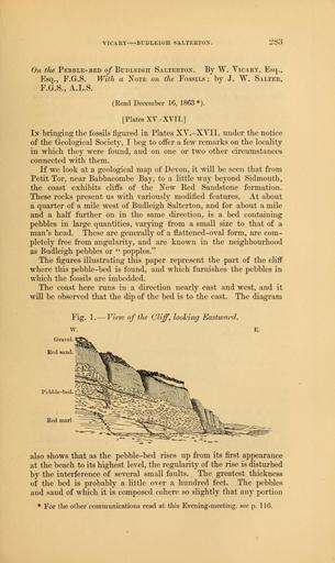 Keywords: The Quarterly journal of the Geological Society of London (12895390644).jpg VICARY BITDLEIOU SALTERTON <br> 283 <br> On the Pebble- bed of Budleigh Salterton By W Vicary Esq <br> Esq F G S With a Note on the Fossils; by J W Salter <br> F U S A L S <br> Read December 16 1863 <br> Plates XV -XVII <br> In bringing the fossils figured in Plates XV -XVII under the notice <br> of the Geological Society I beg to offer a few remarks on the locality <br> in which they Avere found and on one or two other circumstances <br> connected with them <br> If we look at a geological map of Devon it will be seen that from <br> Petit Tor near Babbacombe Bay to a little way beyond Sidmouth <br> the coast exhibits cliffs of the New Red Sandstone formation <br> These rocks present us with variously modified features At about <br> a quarter of a mile west of Budleigh Salterton and for about a mile <br> and a half further on in the same direction is a bed containing <br> pebbles in large quantities varying from a small size to that of a <br> man's head These are generally of a flattened-oval form are com- <br> pletely free from angularity and are known in the neighbourhood <br> as Budleigh pebbles or popples <br> The figures illustrating this paper represent the part of the cliff <br> where this pebble-bed is found and which furnishes the pebbles in <br> which the fossils are imbedded <br> The coast here runs in a direction nearly east and west and it <br> will be observed that the dip of the bed is to the east The diagram <br> Fig 1 <br> View of the Cliff looking Eastward <br> Red marl <br> also shows that as the pebble-bed rises up from its first appearance <br> at the beach to its highest level the regularity of the rise is disturbed <br> by the interference of several small faults The greatest thickness <br> of the bed is probably a little over a hundred feet The pebbles <br> and sand of which it is composed cohere so slightly that any portion <br> For the other communications read at this Evening-meeting see p 116 36089540 111261 51125 Page 283 Text v 20 http //www biodiversitylibrary org/page/36089540 1864 Geological Society of London Biodiversity Heritage Library The Quarterly journal of the Geological Society of London v 20 1864 Geology Periodicals Smithsonian Libraries bhl page 36089540 dc identifier http //biodiversitylibrary org/page/36089540 smithsonian libraries Information field Flickr posted date ISOdate 2014-03-03 Check categories 2015 August 26 CC-BY-2 0 BioDivLibrary https //flickr com/photos/61021753 N02/12895390644 2015-08-26 16 54 00 cc-by-2 0 PD-old-70-1923 The Quarterly journal of the Geological Society of London 1864 Photos uploaded from Flickr by Fæ using a script