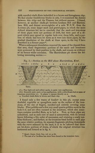 | Keywords: The Quarterly journal of the Geological Society of London (12826412333).jpg 326 <br> PROCEEDINGS OF THE GEOLOGICAL SOCIETY <br> with unrolled chalk-flints imbedded in a brown and ferruginous clay <br> To find similar fossiliferous blocks in situ I re-examined the district <br> between this ridge and the Thames but without success I found <br> however at another chalk-pit between Lenham Hill and Harriets- <br> ham Hill and distant seven-eighths of a mile W N W from the <br> Lenham pit some larger sand- and gravel-pipes in which the more <br> defined structure led me to conclude that the sand- and iron-stone <br> of these pipes were not portions of drift but were part of a de- <br> posit which once spread in regular beds over these hills and a por- <br> tion of which had been let down as it were into these pipes by the <br> gradual dissolution of the chalk at these spots in the way I have <br> described in a former paper <br> When a subsequent denudation removed the mass of the deposit from <br> that area these fragmentary portions of the sands and ironstones <br> were protected by their position in the chalk and remain as evidence <br> of its former wider extension The Harrietsham pit shows the fol- <br> lowing interesting section ” <br> Fig 3 ” Section on the Hill above Harrietsham Kent <br> abode edcba a b a a bed e f e deba <br> x7 I – » \ r v 7 <br> X ' r Km ' <br> Talus <br> f e Fine light-red and yellow sands in parts very argillaceous <br> d-b Greenish sand more or less argillaceous with a subordinate bed or seam of <br> ironstone concretions e In places c reposes directly on a <br> a Unrolled chalk-flints in brown and black clay m Chalk <br> I found only a few traces of fossils f in this pit except some <br> doubtful vegetable or spongiform casts on the surface of the iron- <br> stone of the size of fingers ramified and entirely covering some <br> blocks Flint-pebbles and a few very small quartz-pebbles occur in the <br> beds b-d and are often encased in the ironstone which also some- <br> times contains unrolled flints as in bed a Now as these pipes are <br> cylindrical and as each core of sand is symmetrical with its several <br> layers following a like order of succession and retaining a nearly uni- <br> form thickness ; and further as the ironstone-band holds in each pipe <br> the same relative position its separate fragments pitching downwards <br> with the curve assumed by the sand it is to be inferred that these <br> are let-down portions of strata of which the original structure was <br> horizontal and formed as in fig 4 <br> Quart Journ Geol Soc vol xi p 64 <br> f The cast of a Cardium has since been found in the ironstone here 36214300 111684 51125 Page 326 Text v 14 http //www biodiversitylibrary org/page/36214300 1858 Geological Society of London NameFound Cardium NameConfirmed Cardium EOLID 50301 NameBankID 2693257 Biodiversity Heritage Library The Quarterly journal of the Geological Society of London v 14 1858 Geology Periodicals Smithsonian Libraries bhl page 36214300 dc identifier http //biodiversitylibrary org/page/36214300 smithsonian libraries Information field Flickr posted date ISOdate 2014-02-28 Check categories 2015 August 26 CC-BY-2 0 BioDivLibrary https //flickr com/photos/61021753 N02/12826412333 2015-08-26 17 52 36 cc-by-2 0 PD-old-70-1923 The Quarterly journal of the Geological Society of London 1858 Photos uploaded from Flickr by Fæ using a script |