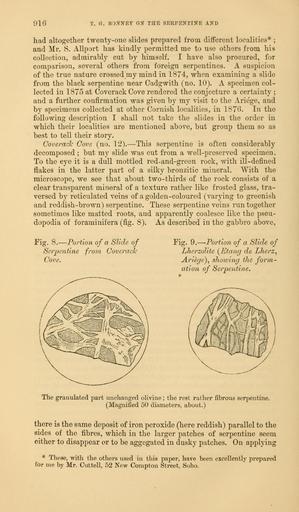 Keywords: The Quarterly journal of the Geological Society of London (12737057674).jpg I shall not take the slides in the order in <br> which their localities are mentioned above but group them so as <br> best to tell their story <br> Coverack Cove no 12 ” This serpentine is often considerably <br> decomposed ; but my slide was cut from a well-preserved specimen <br> To the eye it is a dull mottled red-and-green rock with ill- defined <br> flakes in the latter part of a silky bronzitic mineral With the <br> microscope we see that about two-thirds of the rock consists of a <br> clear transparent mineral of a texture rather like frosted glass tra- <br> versed by reticulated veins of a golden- coloured varying to greenish <br> and reddish-brown serpentine These serpentine veins run together <br> sometimes like matted roots and apparently coalesce like the pseu- <br> dopodia of foraminifera fig 8 As described in the gabbro above <br> Fig 8 ” Portion of a Slide of <br> Serpentine from Coverack <br> Cove <br> Fig 9 ” Portion of a Slide of <br> Lherzolite Etang de Lherz <br> Ariege showing the form- <br> ation of Serpentine <br> The granulated part unchanged olivine ; the rest rather fibrous serpentine <br> Magnified 50 diameters about <br> there is the same deposit of iron peroxide here reddish parallel to the <br> sides of the fibres which in the larger patches of serpentine seem <br> either to disappear or to be aggegated in dusky patches On applying <br> These with the others used in this paper have been excellently prepared <br> for mo by Mr Cuttell 52 New Compton Street Soho 35819111 110705 51125 Page 916 Text 33 http //www biodiversitylibrary org/page/35819111 1877 Geological Society of London Biodiversity Heritage Library The Quarterly journal of the Geological Society of London v 33 1877 Geology Periodicals Smithsonian Libraries bhl page 35819111 dc identifier http //biodiversitylibrary org/page/35819111 smithsonian libraries Information field Flickr posted date ISOdate 2014-02-24 Check categories 2015 August 26 CC-BY-2 0 BioDivLibrary https //flickr com/photos/61021753 N02/12737057674 2015-08-26 20 01 28 cc-by-2 0 PD-old-70-1923 The Quarterly journal of the Geological Society of London 1877 Photos uploaded from Flickr by Fæ using a script |