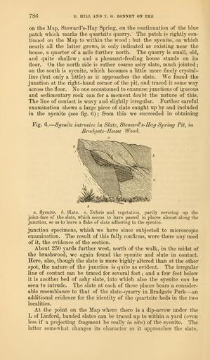 Keywords: The Quarterly journal of the Geological Society of London (12736464255).jpg 780 <br> E HILL AND T ft BONNET ON THE <br> on the Map Stcward's-Hay Spring on the continuation of the blue <br> patch which marks the quartzite quarry The patch is rightly con- <br> tinued on the Map to within the wood ; but the syenite on which <br> nearly all the latter grows is only indicated as existing near the <br> house a quarter of a mile further north The quarry is small old <br> and quite shallow ; and a pheasant-feeding house stands on its <br> floor On the north side is rather coarse ashy slate much jointed ; <br> on the south is syenite which becomes a little more finely crystal- <br> line but only a little as it approaches the slate We found the <br> junction at the right-hand corner of the pit and traced it some way <br> across the floor No one accustomed to examine junctions of igneous <br> and sedimentary rock can for a moment donbt the nature of this <br> The line of contact is wavy and slightly irregular Further careful <br> examination shows a large piece of slate caught up by and included <br> in the syenite see fig 6 ; from this we succeeded in obtaining <br> Fig 6 ” Syenite intrusive in Slate Steward' s-Hay Spring Pit in <br> Bradtjate-House Wood <br> a Syenite b Slate c Debris and vegetation partly covering up the <br> joint-face of the slate which seems to have passed in places almost along the <br> junction so as to leave a flake of slate adhering to the syenite <br> junction specimens which we have since subjected to microscopic <br> examination The result of this fully confirms were there any need <br> of it the evidence of the section <br> About 250 yards further west north of the walk in the midst of <br> the brushwood we again found the syenite and slate in contact <br> Here also though the slate is more highly altered than at the other <br> spot the nature of the junction is quite as evident The irregular <br> line of contact can be traced for several feet ; and a few feet below <br> it is another bed of ashy slate into which also the syenite can be <br> seen to intrude The slate at each of these places bears a consider- <br> able resemblance to that of the slate-quarry in Bradgate Park ” an <br> additional evidence for the identity of the quartzite beds in the two <br> localities <br> At the point on the Map where there is a dip-arrow under the <br> L of Linford banded slates can be traced up to within a yard even <br> less if a projecting fragment be really in situ of the syenite The <br> latter somewhat changes its character as it approaches the slate 35818963 110705 51125 Page 786 Text 33 http //www biodiversitylibrary org/page/35818963 1877 Geological Society of London Biodiversity Heritage Library The Quarterly journal of the Geological Society of London v 33 1877 Geology Periodicals Smithsonian Libraries bhl page 35818963 dc identifier http //biodiversitylibrary org/page/35818963 smithsonian libraries Information field Flickr posted date ISOdate 2014-02-24 Check categories 2015 August 26 CC-BY-2 0 BioDivLibrary https //flickr com/photos/61021753 N02/12736464255 2015-08-26 19 53 51 cc-by-2 0 PD-old-70-1923 The Quarterly journal of the Geological Society of London 1877 Photos uploaded from Flickr by Fæ using a script |