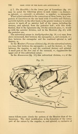 Keywords: The Quarterly journal of the Geological Society of London (12736529043).jpg 700 <br> PROF OWEN ON THE RANK AND AFFINITIES IN <br> § 7 The Mandible ” In the lower jaw of Lacertians fig 20 <br> may be noted the following pieces in each ramus ” 32 dentary ; <br> 33 splenial ; si' coronoid ; 29 articular ; 30 angular ; 31 surangular <br> What is first noticeable in the connexions of these bones in a com- <br> parison of Lacertians on the one hand with Crocodilia and Chelonia <br> and with Ophidia on the other hand is the greater tendency in certain <br> sutures to mark off an anterior half of the ramus including the <br> dentary and splenial from the posterior half; with this modi- <br> fication that in the Iguanians fig 19 the coronoid piece si' would <br> go with the anterior division and in the Monitors fig 20 with <br> the posterior one <br> The subvertical suture in Amblyrhynchus fig 19 s-s runs from <br> above downward first between the surangular 31 and coronoid 31' ; <br> then between the surangular and the combined splenial 33 and <br> dentary 32 <br> In the Monitor Varanus niloticus fig 20 the subvertical suture <br> s-s runs first between the surangular 31 and the dentary 32 ; then <br> between the angular 30 and the combined dentary and splenial <br> A small part of the fore end of the coronoid 31' supplements the <br> upper end of this subvertical suture <br> In the Mosasaurus fig 18 this subvertical division s s of the <br> Fig 18 <br> Mosasaurus <br> ramus follows more closely the pattern of the Monitor than of the <br> Iguanians The chief modification is the formation of the lower <br> part of the suture by the angular 30 and splenial 33 exclusive of 35818877 110705 51125 Page 700 Text 33 http //www biodiversitylibrary org/page/35818877 1877 Geological Society of London NameFound Amblyrhynchus NameConfirmed Amblyrhynchus EOLID 35626 NameBankID 2536011 NameFound Chelonia NameConfirmed Chelonia EOLID 19671 NameBankID 4935336 NameFound Crocodilia NameConfirmed Crocodilia EOLID 1739 NameBankID 582627 NameFound Mosasaurus NameConfirmed Mosasaurus EOLID 4518635 NameBankID 4248162 NameFound Ophidia NameConfirmed Ophidia EOLID 2815988 NameFound Varanus niloticus NameConfirmed Varanus niloticus EOLID 790177 NameBankID 2546407 Biodiversity Heritage Library The Quarterly journal of the Geological Society of London v 33 1877 Geology Periodicals Smithsonian Libraries bhl page 35818877 dc identifier http //biodiversitylibrary org/page/35818877 smithsonian libraries Information field Flickr posted date ISOdate 2014-02-24 CC-BY-2 0 BioDivLibrary https //flickr com/photos/61021753 N02/12736529043 2015-08-26 20 02 17 cc-by-2 0 PD-old-70-1923 The Quarterly journal of the Geological Society of London 1877 Photos uploaded from Flickr by Fæ using a script Mosasaurus |