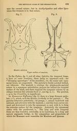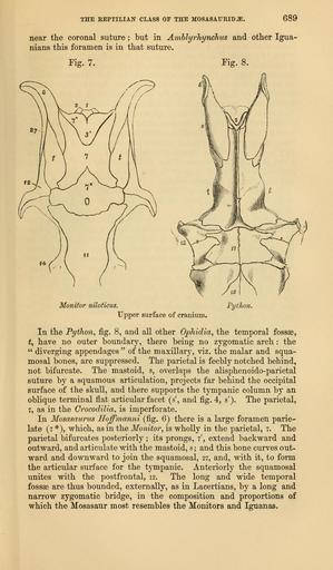 Keywords: The Quarterly journal of the Geological Society of London (12736320215).jpg THE KEPTILIAN CLASS OF THE MOSASAURID <br> 689 <br> near the coronal suture ; but in Amblyrhynchus and other Igua- <br> nians this foramen is in that suture <br> Tig 7 <br> Fig 8 <br> Monitor niloticus <br> Upper surface of cranium <br> Python <br> In the Python fig 8 and all other Ophidia the temporal fossae <br> t y have no outer boundary there being no zygomatic arch the <br> diverging appendages of the maxillary viz the malar and squa- <br> mosal bones are suppressed The parietal is feebly notched behind <br> not bifurcate The mastoid 8 overlaps the alisphenoido-parietal <br> suture by a squamous articulation projects far behind the occipital <br> surface of the skull and there supports the tympanic column by an <br> oblique terminal flat articular facet s' and fig 4 s' The parietal <br> 7 as in the Crocodilia is imperforate <br> In Mosasaurus Hoffrnanni fig 6 there is a large foramen parie- <br> late 7 which as in the Monitor is wholly in the parietal 7 The <br> parietal bifurcates posteriorly ; its prongs 7' extend backward and <br> outward and articulate with the mastoid 8 ; and this bone curves out- <br> ward and downward to join the squamosal 27 and with it to form <br> the articular surface for the tympanic Anteriorly the squamosal <br> unites with the postfrontal 12 The long and wide temporal <br> fossae are thus bounded externally as in Lacertians by a long and <br> narrow zygomatic bridge in the composition and proportions of <br> which the Mosasaur most resembles the Monitors and Iguanas 35818866 110705 51125 Page 689 Text 33 http //www biodiversitylibrary org/page/35818866 1877 Geological Society of London NameFound Amblyrhynchus NameConfirmed Amblyrhynchus EOLID 35626 NameBankID 2536011 NameFound Crocodilia NameConfirmed Crocodilia EOLID 1739 NameBankID 582627 NameFound Igua NameConfirmed Igua NameBankID 4554062 NameFound Mosasaurus NameConfirmed Mosasaurus EOLID 4518635 NameBankID 4248162 Biodiversity Heritage Library The Quarterly journal of the Geological Society of London v 33 1877 Geology Periodicals Smithsonian Libraries bhl page 35818866 dc identifier http //biodiversitylibrary org/page/35818866 smithsonian libraries Information field Flickr posted date ISOdate 2014-02-24 CC-BY-2 0 BioDivLibrary https //flickr com/photos/61021753 N02/12736320215 2015-08-26 20 02 58 cc-by-2 0 PD-old-70-1923 The Quarterly journal of the Geological Society of London 1877 Photos uploaded from Flickr by Fæ using a script Varanus niloticus Python genus |
