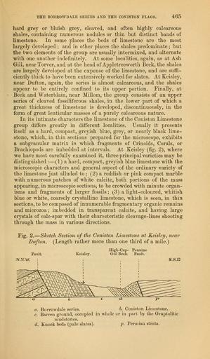 | Keywords: The Quarterly journal of the Geological Society of London (12736136875).jpg THE BORROWDALE SERIES AND THE CONISTON FLAGS <br> 465 <br> hard grey or bluish grey cleaved and often highly calcareous <br> shales containing numerous nodules or thin but distinct bands of <br> limestone In some places the beds of limestone are the most <br> largely developed ; and in other places the shales predominate ; but <br> the two elements of the group are usually intermixed and alternate <br> with one another indefinitely At some localities again as at Ash <br> Gill near Torver and at the head of Appletreeworth Beck the shales <br> are largely developed at the expense of the limestone and are suffi- <br> ciently thick to have been extensively worked for slates At Keisley <br> near Dufton again the series is almost calcareous and the shales <br> appear to be entirely confined to its upper portion Finally at <br> Beck and Waterblain near Millom the group consists of an upper <br> series of cleaved fossiliferous shales in the lower part of which a <br> great thickness of limestone is developed dis continuously in the <br> form of great lenticular masses of a purely calcareous nature <br> In its intimate characters the limestone of the Coniston Limestone <br> group differs greatly in different localities Usually it presents <br> itself as a hard compact greyish blue grey or nearly black lime- <br> stone which in thin sections prepared for the microscope exhibits <br> a subgranular matrix in which fragments of Crinoids Corals or <br> Brachiopods are imbedded at intervals At Keisley fig 2 where <br> we have most carefully examined it three principal varieties may be <br> distinguished ” 1 a hard compact greyish blue limestone with the <br> microscopic characters and general aspect of the ordinary variety of <br> the limestone just alluded to ; 2 a reddish or pink compact marble <br> with numerous patches of white calcite both portions of the mass <br> appearing in microscopic sections to be crowded with minute organ- <br> isms and fragments of larger fossils ; 3 a light- coloured whitish <br> blue or white coarsely crystalline limestone which is seen in thin <br> sections to be composed of innumerable fragmentary organic remains <br> and microzoa ; imbedded in transparent calcite and having large <br> crystals of calc-spar with their characteristic cleavage-lines shooting <br> through the mass in various directions <br> Fig 2 ” Sketch Section of the Coniston Limestone at Keisley near <br> Dufton Length rather more than one third of a mile <br> Fault <br> Jsi' N W <br> Keisley <br> High-Cup- Pennine <br> Gill Beck Fault <br> S S B <br> a Borrowdale series b Coniston Limestone <br> c Barren ground occupied in whole or in part by the Graptolitic <br> mudstones <br> d Knock beds pale slates p Permian strata 35818616 110705 51125 Page 465 Text 33 http //www biodiversitylibrary org/page/35818616 1877 Geological Society of London Biodiversity Heritage Library The Quarterly journal of the Geological Society of London v 33 1877 Geology Periodicals Smithsonian Libraries bhl page 35818616 dc identifier http //biodiversitylibrary org/page/35818616 smithsonian libraries Information field Flickr posted date ISOdate 2014-02-24 Check categories 2015 August 26 CC-BY-2 0 BioDivLibrary https //flickr com/photos/61021753 N02/12736136875 2015-08-26 20 03 38 cc-by-2 0 PD-old-70-1923 The Quarterly journal of the Geological Society of London 1877 Photos uploaded from Flickr by Fæ using a script |