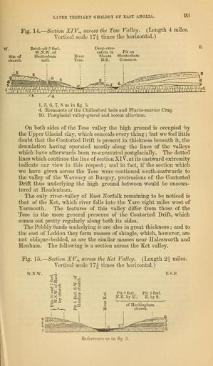 | Keywords: The Quarterly journal of the Geological Society of London (12735675005).jpg LATER TERTIARY GEOLOGY OF EAST ANGLIA <br> 93 <br> Fig 14 __ Section XIV across the Tese Valley Length 4 miles <br> Yortical scale 17£ times the horizontal <br> Brick-pit 5 furl <br> W N W of <br> Site of Shottesham <br> church mill <br> River <br> Tese <br> Deep exca- <br> vation in Pit on <br> Sheets Shottesham <br> Hill Common <br> E <br> 1 5 6 7 8 as in fig o <br> 4 Remnants of the Chillesford beds and Fluvio-marine Crag <br> 10 Postglacial valley-gravel and recent alluvium <br> On both sides of the Tese valley the high ground is occupied by <br> the Upper Glacial clay which conceals every thing ; but we feel little <br> doubt that the Contorted Drift is present in thickness beneath it the <br> denudation having operated mostly along the lines of the valleys <br> which have afterwards been re-excavated postglacially The dotted <br> lines which continue the line of section XIY at its eastward extremity <br> indicate our view in this respect ; and in fact if the section which <br> we have given across the Tese were continued south-eastwards to <br> the valley of the Waveney at Bungay protrusions of the Contorted <br> Drift thus underlying the high ground between would be encoun- <br> tered at Headenham <br> The only river-valley of East Norfolk remaining to be noticed is <br> that of the Ket which river falls into the Yare eight miles west of <br> Yarmouth The features of this valley differ from those of the <br> Tese in the more general presence of the Contorted Drift which <br> comes out pretty regularly along both its sides <br> The Pebbly Sands underlying it are also in great thickness ; and to <br> the east of Loddon they form masses of shingle which however are <br> not oblique-bedded as are the similar masses near Halesworth and <br> Henham The following is a section across the Ket valley <br> Fig 15 - <br> W N W <br> -Section XV across the Ket Valley Length 2\ miles <br> Yertical scale 17 \ times the horizontal <br> Pit ofurl <br> E by S <br> E S E <br> References as in fi£ 5 35818196 110705 51125 Page 93 Text 33 http //www biodiversitylibrary org/page/35818196 1877 Geological Society of London Biodiversity Heritage Library The Quarterly journal of the Geological Society of London v 33 1877 Geology Periodicals Smithsonian Libraries bhl page 35818196 dc identifier http //biodiversitylibrary org/page/35818196 smithsonian libraries Information field Flickr posted date ISOdate 2014-02-24 Check categories 2015 August 26 CC-BY-2 0 BioDivLibrary https //flickr com/photos/61021753 N02/12735675005 2015-08-26 20 01 08 cc-by-2 0 PD-old-70-1923 The Quarterly journal of the Geological Society of London 1877 Photos uploaded from Flickr by Fæ using a script |