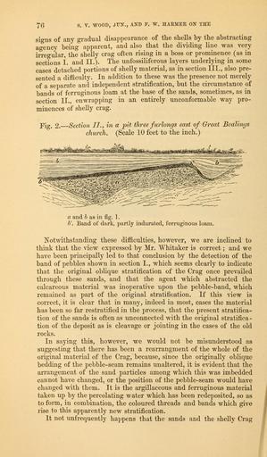 | Keywords: The Quarterly journal of the Geological Society of London (12735773383).jpg 76 <br> S V WOOD J TIN AND F W HARMER ON THE <br> signs of any gradual disappearance of the shells by the abstracting <br> agency being apparent and also that the dividing line was very <br> irregular the shelly crag often rising in a boss or prominence as in <br> sections I and II The unfossiliferous layers underlying in some <br> cases detached portions of shelly material as in section III also pre- <br> sented a difficulty In addition to these was the presence not merely <br> of a separate and independent stratification but the circumstance of <br> bands of ferruginous loam at the base of the sands sometimes as in <br> section II enwrapping in an entirely unconformable way pro- <br> minences of shelly crag <br> Fig 2 /Section II in a pit three furlongs east of Great Bealinys <br> church Scale 10 feet to the inch <br> a and b as in fig 1 <br> b\ Band of dark partly indurated ferruginous loam <br> Notwithstanding these difficulties however we are inclined to <br> think that the view expressed by Mr Whitaker is correct ; and we <br> have been principally led to that conclusion by the detection of the <br> band of pebbles shown in section I which seems clearly to indicate <br> that the original oblique stratification of the Crag once prevailed <br> through these sands and that the agent which abstracted the <br> calcareous material was inoperative upon the pebble-band which <br> remained as part of the original stratification If this view is <br> correct it is clear that in many indeed in most cases the material <br> has been so far restratified in the process that the present stratifica- <br> tion of the sands is often as unconnected with the original stratifica- <br> tion of the deposit as is cleavage or jointing in the cases of the old <br> rocks <br> In saying this however we would not be misunderstood as <br> suggesting that there has been a rearrangment of the whole of the <br> original material of the Crag because since the originally oblique <br> bedding of the pebble-seam remains unaltered it is evident that the <br> arrangement of the sand particles among which this was imbedded <br> cannot have changed or the position of the pebble-seam would have <br> changed with them It is the argillaceous and ferruginous material <br> taken up by the percolating water which has been redeposited so as <br> to form in combination the coloured threads and bands which give <br> rise to this apparently new stratification <br> It not unfrequently happens that the sands and the shelly Crag 35818179 110705 51125 Page 76 Text 33 http //www biodiversitylibrary org/page/35818179 1877 Geological Society of London Biodiversity Heritage Library The Quarterly journal of the Geological Society of London v 33 1877 Geology Periodicals Smithsonian Libraries bhl page 35818179 dc identifier http //biodiversitylibrary org/page/35818179 smithsonian libraries Information field Flickr posted date ISOdate 2014-02-24 Check categories 2015 August 26 CC-BY-2 0 BioDivLibrary https //flickr com/photos/61021753 N02/12735773383 2015-08-26 20 03 07 cc-by-2 0 PD-old-70-1923 The Quarterly journal of the Geological Society of London 1877 Photos uploaded from Flickr by Fæ using a script |