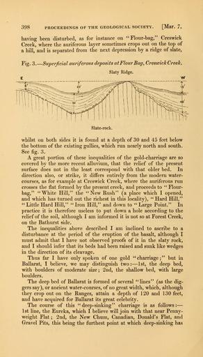 Keywords: The Quarterly journal of the Geological Society of London (12711524765).jpg 398 <br> PROCEEDINGS OF THE GEOLOGICAL SOCIETY Mar 7 <br> having been disturbed as for instance on Flour-bag Creswick <br> Creek where the auriferous layer sometimes crops out on the top of <br> a hill and is separated from the next depression by a ridge of slate <br> Fig 3 ” Superficial auriferous deposits at Flour Bag Creswick Creek <br> Slaty Ridge <br> Slate-rock <br> whilst on both sides it is found at a depth of 30 and 45 feet below <br> the bottom of the existing gullies which run nearly north and south <br> See fig 3 <br> A great portion of these inequalities of the gold-charriage are so <br> covered by the more recent alluvium that the relief of the present <br> surface does not in the least correspond with that older bed In <br> direction also or strike it differs entirely from the modern water- <br> courses as for example at Creswick Creek where the auriferous run <br> crosses the flat formed by the present creek and proceeds to Flour- <br> bag White Hill the New Rush a place which I opened <br> and which has turned out the richest in this locality Hard Hill <br> Little Hard Hill Iron Hill and down to Large Point In <br> practice it is therefore useless to put down a hole according to the <br> relief of the soil although I am informed it is not so at Forest Creek <br> on the Bathurst side <br> The inequalities above described I am inclined to ascribe to a <br> disturbance at the period of the eruption of the basalt although I <br> must admit that I have not observed proofs of it in the slaty rock <br> and I should infer that its beds had been raised and sunk like wedges <br> in the direction of its cleavage <br> Thus far I have only spoken of one gold charriage; but in <br> Ballarat I believe we may distinguish two ” 1st the deep bed <br> with boulders of moderate size ; 2nd the shallow bed with large <br> boulders <br> The deep bed of Ballarat is formed of several lines as the dig- <br> gers say or ancient water-courses of no great width which although <br> they crop out on the Ranges attain a depth of 120 and 130 feet <br> and have acquired for Ballarat its great celebrity <br> The course of this deep-sinking charriage is as follows ” <br> 1st line the Eureka which I believe will join with that near Penny- <br> weight Flat ; 2nd the New Chum Canadian Donald's Flat and <br> Gravel Pits this being the furthest point at which deep-sinking has 35614986 110213 51125 Page 398 Text v 11 http //www biodiversitylibrary org/page/35614986 1855 Geological Society of London Biodiversity Heritage Library The Quarterly journal of the Geological Society of London v 11 1855 Geology Periodicals Smithsonian Libraries bhl page 35614986 dc identifier http //biodiversitylibrary org/page/35614986 smithsonian libraries Information field Flickr posted date ISOdate 2014-02-23 Check categories 2015 August 26 CC-BY-2 0 BioDivLibrary https //flickr com/photos/61021753 N02/12711524765 2015-08-26 20 59 00 cc-by-2 0 PD-old-70-1923 The Quarterly journal of the Geological Society of London 1855 Photos uploaded from Flickr by Fæ using a script |
