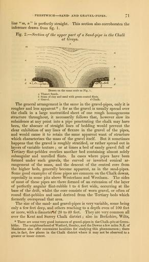 | Keywords: The Quarterly journal of the Geological Society of London (12711373265).jpg PRESTWICH SAND- AND GRAVEL-PIPES <br> 71 <br> line m n is perfectly straight This section also corroborates the <br> inference drawn from fis- 1 <br> Fig 2 Section of the upper part of a Sand-pipe in the Chalk <br> at Grays <br> Drawn on the same scale as Fig 1 <br> n Thanet Sands <br> b Seam of clay and sand with green-coated flints <br> c Gravel d Chalk <br> The general arrangement is the same in the gravel-pipes only it is <br> rougher and less apparent ; for as the gravel is usually spread over <br> the chalk in a large unstratified sheet of one rough homogeneous <br> structure throughout it necessarily follows that however slow its <br> subsidence at any point into a pipe penetrating the chalk may have <br> been the absence of straight lines of bedding would prevent the <br> clear exhibition of any lines of flexure in the gravel of the pipes <br> and would cause it to retain the same apparent want of structure <br> which characterises the mass of the gravel itself But it sometimes <br> happens that the gravel is roughly stratified or rather spread out in <br> layers of variable texture ; or at times a bed of sandy gravel full of <br> Tertiary flint-pebbles overlies another bed containing almost solely <br> subangular and unrolled flints In cases where pipes have been <br> formed under such gravels the curved or inverted conical ar- <br> rangement of the mass and the descent of the central core from <br> the higher beds generally become apparent as in the sand-pipes <br> Some good examples of these pipes are common on the Chalk downs <br> especially in some pits above Westerham and Wrotham The sides <br> of most of these pipes are there formed of an extension of the layer <br> of perfectly angular flint-rubble 1 to 4 feet wide occurring at the <br> base of the drift whilst the core consists of worn gravel or often of <br> round flint-pebbles and sand derived from the Tertiary beds which <br> formerly overspread that area <br> The size of the sand- and gravel-pipes is very variable some being <br> only a few feet deep and others reaching to a depth even of 100 feet <br> or more with a diameter'of 20 to 40 feet They are very common all <br> over the Kent and Surrey Chalk district ; also in Berkshire Wilts <br> There are some very good instances of gravel-pipes in the Chalk-pits at Green- <br> hithe The neighbourhood of Watford Henley and the Downs a few miles N E of <br> Maidstone also offer convenient localities for studying this phenomenon ; there <br> are in fact few places in the Chalk district where it may not be observed to a <br> greater or lesser extent 35614637 110213 51125 Page 71 Text v 11 http //www biodiversitylibrary org/page/35614637 1855 Geological Society of London Biodiversity Heritage Library The Quarterly journal of the Geological Society of London v 11 1855 Geology Periodicals Smithsonian Libraries bhl page 35614637 dc identifier http //biodiversitylibrary org/page/35614637 smithsonian libraries Information field Flickr posted date ISOdate 2014-02-23 Check categories 2015 August 26 CC-BY-2 0 BioDivLibrary https //flickr com/photos/61021753 N02/12711373265 2015-08-26 20 58 27 cc-by-2 0 PD-old-70-1923 The Quarterly journal of the Geological Society of London 1855 Photos uploaded from Flickr by FĂŚ using a script |
