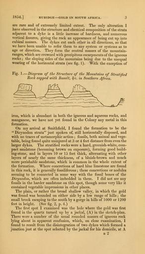 Keywords: The Quarterly journal of the Geological Society of London (12711282445).jpg 1854 RUBIDGE GOLD IN SOUTH AFRICA 3 <br> are rare and of extremely limited extent The only alteration I <br> have observed in the structure and chemical composition of the strata <br> adjacent to a dyke is a little increase of hardness and numerous <br> vertical fissures giving the rock an appearance of being cut up into <br> cubical masses The dykes cut each other in all directions so that <br> we have been unable to refer them to any system or systems as to <br> age or direction They form the central masses of the mountain- <br> ranges which are crowned with precipitous escarpments of the igneous <br> rocks ; the sloping sides of the mountains being due to the unequal <br> wearing of the horizontal strata see fig 1 With the exception of <br> Fig- 1 ˘ Diagram of the Structure of the Mountains of Stratified <br> Rock capped with Basalt c in Southern Africa <br> iron which is abundant in both the igneous and aqueous rocks and <br> manganese we have not yet found in the Colony any metal in this <br> formation <br> On my arrival at Smithfield I found the formation to be the <br> Dicynodon strata just spoken of still horizontally disposed and <br> with no traces of metamorphic action ; fossils both animal and vege- <br> table being found quite uninjured at 3 or 4 feet distance from even the <br> larger dykes The stratified rocks were a hard greenish-white com- <br> pact sandstone becoming brown on exposure forming good build- <br> ing-stone and in layers 10 or 15 feet thick alternating with other <br> layers of nearly the same thickness of a bluish-brown and much <br> more perishable sandstone which is common in the whole extent of <br> the formation Where concretions of hard blue limestone are found <br> in this rock it is generally fossiliferous ; these concretions or nodules <br> seeming to be connected in some way with the fossil bones of the <br> Dicynodon which are often imbedded in them I did not see any <br> fossils in the harder sandstone on this spot though some very like it <br> contained vegetable impressions in other places <br> The plain or rather the broad shallow valley in which the gold <br> was found was bounded on either side by a low range of hills ; the <br> small brook escaping to the south by a gorge in hills of 1000 or 1200 <br> feet in height See fig 2 p 4 <br> The first spot I examined was the hole where the gold was first <br> found in the quartz turned up by a jackal A in the sketch-plan <br> There were a number of the usual rounded masses of igneous rock <br> lying about in apparent confusion which on close examination I <br> found to result from the disintegration of two dykes which formed a <br> junction just at the spot selected by the jackal for his domicile at A <br> B 2 35614557 110213 51125 Page 3 Text v 11 http //www biodiversitylibrary org/page/35614557 1855 Geological Society of London NameFound Dicynodon NameConfirmed Dicynodon EOLID 4522858 NameBankID 4142930 NameFound Dicynodon strata Biodiversity Heritage Library The Quarterly journal of the Geological Society of London v 11 1855 Geology Periodicals Smithsonian Libraries bhl page 35614557 dc identifier http //biodiversitylibrary org/page/35614557 smithsonian libraries Information field Flickr posted date ISOdate 2014-02-23 Check categories 2015 August 26 CC-BY-2 0 BioDivLibrary https //flickr com/photos/61021753 N02/12711282445 2015-08-26 21 01 27 cc-by-2 0 PD-old-70-1923 The Quarterly journal of the Geological Society of London 1855 Photos uploaded from Flickr by FĂŚ using a script |