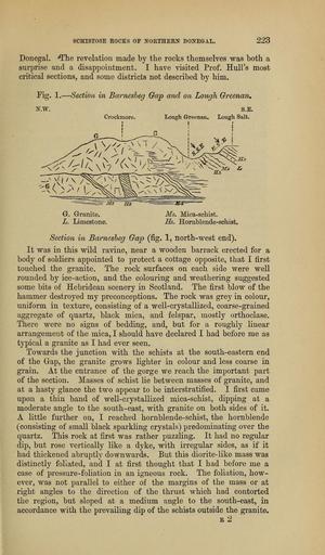 | Keywords: The Quarterly journal of the Geological Society of London (14096462793).jpg SCHISTOSE ROCKS OF NORTHERN DONEGAL <br> 223 <br> Donegal 'The revelation made by the rocks themselves was both a <br> surprise and a disappointment I have visited Prof Hull's most <br> critical sections and some districts not described by him <br> Pig 1 ” Section in Bar <br> Gap and on Lough Greenan <br> S E <br> Lough G-reenan Lough Salt <br> I <br> I <br> G Granite <br> L Limestone <br> Ms Mica-scliist <br> Hs Hornblende-schist <br> Section in Barnesheg Gap fig 1 north-west end <br> It was in this wild ravine near a wooden barrack erected for a <br> body of soldiers appointed to protect a cottage opposite that I fi rst <br> touched the granite The rock surfaces on each side were well <br> rounded by ice-action and the colouring and weathering suggested <br> some bits of Hebridean scenery in Scotland The first blow of the <br> hammer destroyed my preconceptions The rock was grey in colour <br> uniform in texture consisting of a well-crystallized coarse-grained <br> aggregate of quartz black mica and felspar mostly orthoclase <br> There were no signs of bedding and but for a roughly linear <br> arrangement of the mica I should have declared I had before me as <br> typical a granite as I had ever seen <br> Towards the junction with the schists at the south-eastern end <br> of the Gap the granite grows lighter in colour and less coarse in <br> grain At the entrance of the gorge we reach the important part <br> of the section Masses of schist lie between masses of granite and <br> at a hasty glance the two appear to be interstratified I first came <br> upon a thin band of well-crystallized mica-schist dipping at a <br> moderate angle to the south-east with granite on both sides of it <br> A little further on I reached hornblende-schist the hornblende <br> consisting of small black sparkling crystals predominating over the <br> quartz This rock at first was rather puzzling It had no regular <br> dip but rose vertically like a dyke with irregular sides as if it <br> had thickened abruptly downwards But this diorite-like mass was <br> distinctly foliated and I at first thought that I had before me a <br> case of pressure-foliation in an igneous rock The foliation how- <br> ever was not parallel to either of the margins of the mass or at <br> right angles to the direction of the thrust which had contorted <br> the region but sloped at a medium angle to the south-east in <br> accordance with the prevailing dip of the schists outside the granite <br> r2 37047075 114009 51125 Page 223 Text 41 http //www biodiversitylibrary org/page/37047075 1885 Geological Society of London Biodiversity Heritage Library The Quarterly journal of the Geological Society of London v 41 1885 Geology Periodicals Smithsonian Libraries bhl page 37047075 dc identifier http //biodiversitylibrary org/page/37047075 smithsonian libraries Information field Flickr posted date ISOdate 2014-04-30 Check categories 2015 August 26 CC-BY-2 0 BioDivLibrary https //flickr com/photos/61021753 N02/14096462793 2015-08-26 04 51 54 cc-by-2 0 PD-old-70-1923 The Quarterly journal of the Geological Society of London 1885 Photos uploaded from Flickr by Fæ using a script |