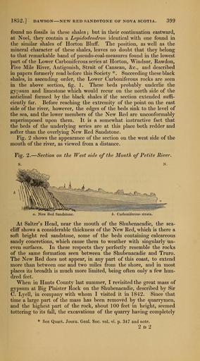 Keywords: The Quarterly journal of the Geological Society of London (12684836304).jpg 1852 DAWSON NEW RED SANDSTONE OF NOVA SCOTIA 399 <br> found no fossils in these shales ; but in their continuation eastward <br> at Noel they contain a Lepidodendron identical with one found in <br> the similar shales of Horton Bluff The position as well as the <br> mineral character of these shales leaves no doubt that they belong <br> to that remarkable band of pseudo-coal-measures found in the lowest <br> part of the Lower Carboniferous series at Horton Windsor Rawdon <br> Five Mile River Antigonish Strait of Canseau c and described <br> in papers formerly read before this Society Succeeding these black <br> shales in ascending order the Lower Carboniferous rocks are seen <br> in the above section fig 1 These beds probably underlie the <br> gypsum and limestone which would recur on the north side of the <br> anticlinal formed by the black shales if the section extended suffi- <br> ciently far Before reaching the extremity of the point on the east <br> side of the river however the edges of the beds sink to the level of <br> the sea and the lower members of the New Red are unconformably <br> superimposed upon them It is a somewhat instructive fact that <br> the beds of the underlying series are at this place both redder and <br> softer than the overlying New Red Sandstone <br> Fig 2 shows the appearance of the section on the west side of the <br> mouth of the river as viewed from a distance <br> Fig 2 Section on the West side of the Mouth of Petite River <br> a New Red Sandstone b Carboniferous strata <br> At Salter's Head near the mouth of the Shubenacadie the sea- <br> cUff shows a considerable thickness of the New Red which is there a <br> soft bright red sandstone some of the beds containing calcareous <br> sandy concretions which cause them to weather with singularly un- <br> even surfaces In these respects they perfectly resemble the rocks <br> of the same formation seen between the Shubenacadie and Truro <br> The New Red does not appear in any part of this coast to extend <br> more than between one and two miles from the shore and in most <br> places its breadth is much more limited being often only a ies hun- <br> dred feet <br> When in Hants County last summer I revisited the great mass of <br> gypsum at Big Plaister Rock on the Shubenacadie described by Sir <br> C Lyell in company with whom I visited it in 1842 Since that <br> time a large part of the mass has been removed by the quarrymen <br> and the highest part of the rock about 100 feet in height seemed <br> tottering to its fall the excavations of the quarry having completely <br> See Quart Journ Geol Soc vol vi p 347 and note <br> 2 D 2 35461469 109911 51125 Page 399 Text v 8 http //www biodiversitylibrary org/page/35461469 1852 Geological Society of London NameFound Lepidodendron NameConfirmed Lepidodendron EOLID 13132167 NameBankID 4921583 Biodiversity Heritage Library The Quarterly journal of the Geological Society of London v 8 1852 Geology Periodicals Smithsonian Libraries bhl page 35461469 dc identifier http //biodiversitylibrary org/page/35461469 smithsonian libraries Information field Flickr posted date ISOdate 2014-02-21 Check categories 2015 August 26 CC-BY-2 0 BioDivLibrary https //flickr com/photos/61021753 N02/12684836304 2015-08-26 20 55 13 cc-by-2 0 PD-old-70-1923 The Quarterly journal of the Geological Society of London 1852 Photos uploaded from Flickr by FĂŚ using a script |