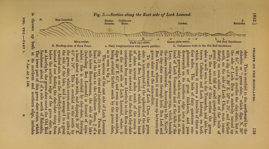 | Keywords: The Quarterly journal of the Geological Society of London (12684138465).jpg 1852 <br> SHARPE ON THE HIGHLANDS <br> 129 <br> ¢ PS -c <br> is thrown up both <br> VOL YIII PART <br> slate This is overlaid to the northward by the <br> chloritic or green slate which dips N 20° <br> W 65° where it overlies the clay-slate but at <br> the side of Loch Dow is suddenly turned up <br> with a dip of S 20° E 50° to 70° and farther <br> north on the side of Loch Chon rests imme- <br> diately on mica -schist Some of the beds of <br> green slate are full of small quartz-pebbles <br> To the eastward of this section the green <br> slate is well seen in the Trossachs and also be- <br> tween Callander and Loch Lubnaig on both <br> which sections it covers a breadth of three or <br> four miles The beds of slaty quartzose con- <br> glomerate are of great thickness and pass <br> downwards on its southern edge into a coarse <br> slaty greywacke which may be seen both at the <br> head of Loch Vennachar and at the falls of the <br> Leny resting on greenstone-trap which bounds <br> the slates southwards According to Mr Nicol <br> the clay-slate runs through both Ben Ledi and <br> Ben Venue where it must come up between the <br> green slate and the mica-schist <br> To the westward of Loch Chon the green <br> slate is interrupted by the upheaval of the mica- <br> schist of Ben Lomond which throws the band <br> of slates several miles south of the course it <br> follows to the eastward ; but the dark clay-slate <br> continues from near Aberfoyle to the Ross point <br> on the west side of Loch Lomond where it <br> dips S 20° E 65° and rests on the mica-schist <br> being overlaid farther south by the green slate <br> as is seen in fig 3 <br> The section of the east side of Loch Lomond <br> fig 3 is very clear and instructive From the <br> head of the lake to the Cullimore Burn f of a <br> mile below Rowardennan the side of the lake <br> including Ben Lomond is formed of mica- <br> schist this is overlaid by clay-slate forming <br> a band about a mile wide and dipping S 20° E <br> 65° to 70° This is overlaid on the south by <br> the green slate which covers about four miles of <br> the side of the lake and is arranged in a great <br> synclinal axis as on the Aberfoyle section ; but <br> instead of our finding the clay-slate rising from <br> below the southern edge of the green slate as <br> at Aberfoyle the green slate meets the Old Red <br> Sandstone about f of a mile north of Balmaha <br> The lower part of this green slate series which <br> at its northern and southern edge includes <br> Loc cit p 149 <br> I K 35461131 109911 51125 Page 129 Text v 8 http //www biodiversitylibrary org/page/35461131 1852 Geological Society of London Biodiversity Heritage Library The Quarterly journal of the Geological Society of London v 8 1852 Geology Periodicals Smithsonian Libraries bhl page 35461131 dc identifier http //biodiversitylibrary org/page/35461131 smithsonian libraries Information field Flickr posted date ISOdate 2014-02-21 Check categories 2015 August 26 CC-BY-2 0 BioDivLibrary https //flickr com/photos/61021753 N02/12684138465 2015-08-27 11 54 30 cc-by-2 0 PD-old-70-1923 The Quarterly journal of the Geological Society of London 1852 Photos uploaded from Flickr by Fæ using a script |