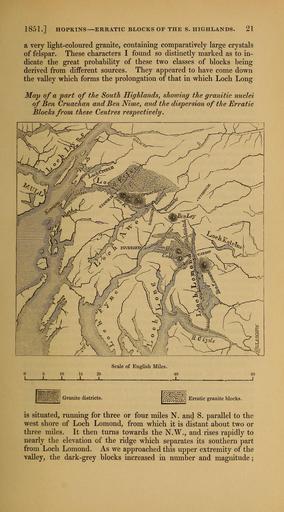 | Keywords: The Quarterly journal of the Geological Society of London (12684208663).jpg 1851 HOPKINS ” ERRATIC BLOCKS OF THE S HIGHLANDS <br> 21 <br> a very light-coloured granite containing comparatively large crystals <br> of felspar These characters I found so distinctly marked as to in- <br> dicate the great probability of these two classes of blocks being <br> derived from different sources They appeared to have come down <br> the valley which forms the prolongation of that in which Loch Long <br> Map of a part of the South Highlands showing the granitic nuclei <br> of Ben Cruachan andBenNime and the dispersion of the Erratic <br> Blocks from these Centres respectively <br> Scale of English Miles <br> Granite districts <br> ' – – yCo y i-- Erratic granite blocks <br> is situated running for three or four miles N and S parallel to the <br> west shore of Loch Lomond from which it is distant about two or <br> three miles It then turns towards the N W and rises rapidly to <br> nearly the elevation of the ridge which separates its southern part <br> from Loch Lomond As we approached this upper extremity of the <br> valley the dark-grey blocks increased in number and magnitude ; 35461011 109911 51125 Page 21 Text v 8 http //www biodiversitylibrary org/page/35461011 1852 Geological Society of London Biodiversity Heritage Library The Quarterly journal of the Geological Society of London v 8 1852 Geology Periodicals Smithsonian Libraries bhl page 35461011 dc identifier http //biodiversitylibrary org/page/35461011 smithsonian libraries Information field Flickr posted date ISOdate 2014-02-21 Check categories 2015 August 26 CC-BY-2 0 BioDivLibrary https //flickr com/photos/61021753 N02/12684208663 2015-08-27 11 54 51 cc-by-2 0 PD-old-70-1923 The Quarterly journal of the Geological Society of London 1852 Photos uploaded from Flickr by Fæ using a script |