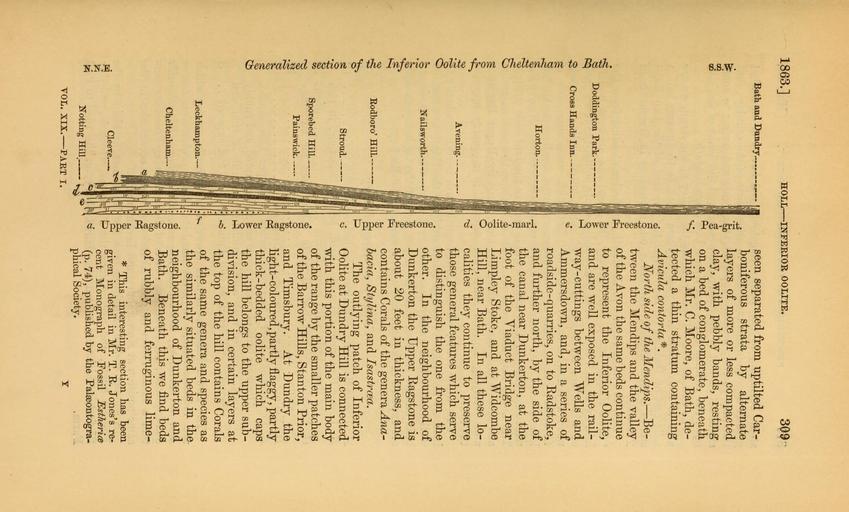| Keywords: The Quarterly journal of the Geological Society of London (12645914533).jpg 1863 <br> HOLL INFERIOR OOLITE <br> 309 <br> <br> o <br> O <br> o <br> – Si <br> o <br> S <br> Cb <br> Bath and Dundry <br> S Doddington Park <br> ¢2 Cross Hands Inn <br> § Horton <br> Q <br> Avening <br> Nailsworth <br> Rodboro' Hill <br> Stroud <br> Sporebed Hill <br> Painswick ” <br> Leckhampton <br> Cheltenham <br> Cleeve <br> V <br> dotting Hill <br> VOL XIX <br> 3 <br> 3 <br> Pn <br> tf <br> PART I <br> seen separated from uptilted Car- <br> boniferous strata by alternate <br> layers of more or less compacted <br> clay with pebbly bands resting <br> on a bed of conglomerate beneath <br> which Mr C Moore of Bath de- <br> tected a thin stratum containing <br> Avicula contorta <br> North side of the Mendrps ” Be- <br> tween the Mendips and the valley <br> of the Avon the same beds continue <br> to represent the Inferior Oolite <br> and are well exposed in the rail- <br> way-cuttings between Wells and <br> Ammersdown and in a series of <br> roadside-quarries on to Radstoke <br> and further north by the side of <br> the canal near Dunkerton at the <br> foot of the Viaduct Bridge near <br> Limpley Stoke and at Widcombe <br> Hill near Bath In all these lo- <br> calities they continue to preserve <br> those general features which serve <br> to distinguish the one from the <br> other In the neighbourhood of <br> Dunkerton the Upper Bagstone is <br> about 20 feet in thickness and <br> contains Corals of the genera Ana- <br> bacia Stylina and Isastrcea <br> The outlying patch of Inferior <br> Oolite at Dundry Hill is connected <br> with this portion of the main body <br> of the range by the smaller patches <br> of the Barrow Hills Stanton Prior <br> and Timsbury At Dundry the <br> light-coloured partly flaggy partly <br> thick-bedded oolite which caps <br> the hill belongs to the upper sub- <br> division and in certain layers at <br> the top of the hill contains Corals <br> of the same genera and species as <br> the similarly situated beds in the <br> neighbourhood of Dunkerton and <br> Bath Beneath this we find beds <br> of rubbly and ferruginous lime- <br> This interesting section has been <br> given in detail in Mr T R Jones's re- <br> cent Monograph of Fossil Estherice <br> p 74 published by the Palseontogra- <br> phical Society 35328274 109632 51125 Page 309 Text v 19 http //www biodiversitylibrary org/page/35328274 1863 Geological Society of London NameFound Avicula contorta NameConfirmed Avicula contorta NameFound Stylina NameConfirmed Stylina EOLID 4687593 NameBankID 239520 Biodiversity Heritage Library The Quarterly journal of the Geological Society of London v 19 1863 Geology Periodicals Smithsonian Libraries bhl page 35328274 dc identifier http //biodiversitylibrary org/page/35328274 smithsonian libraries Information field Flickr posted date ISOdate 2014-02-20 Check categories 2015 August 26 CC-BY-2 0 BioDivLibrary https //flickr com/photos/61021753 N02/12645914533 2015-08-27 12 00 25 cc-by-2 0 PD-old-70-1923 The Quarterly journal of the Geological Society of London 1863 Photos uploaded from Flickr by Fæ using a script |