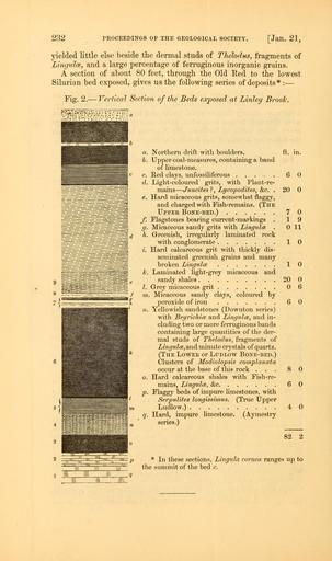 Keywords: The Quarterly journal of the Geological Society of London (12645745725).jpg 232 <br> PROCEEDINGS OF THE GEOLOGICAL SOCIETY Jan 21 <br> yielded little else beside the dermal studs of Thelodus fragments of <br> Lingulce and a large percentage of ferruginous inorganic grains <br> A section of about 80 feet through the Old Red to the lowest <br> Silurian bed exposed gives us the following series of deposits <br> Fig 2 Vertical Section of the Beds exposed at Linley Brook <br> -'J V- ' ' - ˘ -- '- ' ' a <br> a Northern drift with boulders ft in <br> b Upper coal-measures containing a band <br> of limestone <br> c Red clays unfossiliferous 60 <br> d Light-coloured grits with Plant-re- <br> mains Juncites Lycopodites c 20 <br> e Hard micaceous grits somewhat flaggy <br> and charged with Fish-remains The <br> Upper Bone-bed 7 <br> f Flagstones bearing current-markings 1 9 <br> g Micaceous sandy grits with Lingulce 11 <br> h Greenish irregularly laminated rock <br> with conglomerate 10 <br> i Hard calcareous grit with thickly dis- <br> seminated greenish grains and many <br> broken Lingulce 10 <br> Jc Laminated light-grey micaceous and <br> sandy shales 20 <br> I Grey micaceous grit 6 <br> m Micaceous sandy clays coloured by <br> peroxide of iron 6 <br> n Yellowish sandstones Downton series <br> with Beyrichice and Lingulce and in- <br> cluding two or more ferruginous bands <br> containing large quantities of the der- <br> mal studs of Thelodus fragments of <br> Lingulce nd minute crystals of quartz <br> The Lower or Ludlow Bone-bed <br> Clusters of Modiolopsis complanata <br> occur at the base of this rock 80 <br> o Hard calcareous shales with Fish-re- <br> mains Lingulce c 6 <br> p Flaggy beds of impure limestones with <br> Serpulites longissimus True Upper <br> Ludlow 4 <br> q Hard impure limestone Aymestry <br> series <br> 82 2 <br> 9 f <br> In these sections Lingula cornea ranges up to <br> the summit of the bed c 35328193 109632 51125 Page 232 Text v 19 http //www biodiversitylibrary org/page/35328193 1863 Geological Society of London NameFound Lingula cornea NameConfirmed Lingula cornea NameBankID 7057762 NameFound Lycopodites NameConfirmed Lycopodites NameBankID 4853060 NameFound Micaceous NameFound Modiolopsis complanata NameConfirmed Modiolopsis complanata NameFound Serpulites longissimus NameConfirmed Serpulites longissimus NameBankID 6674114 NameFound Thelodus NameConfirmed Thelodus EOLID 13104955 NameBankID 4368403 Biodiversity Heritage Library The Quarterly journal of the Geological Society of London v 19 1863 Geology Periodicals Smithsonian Libraries bhl page 35328193 dc identifier http //biodiversitylibrary org/page/35328193 smithsonian libraries Information field Flickr posted date ISOdate 2014-02-20 Check categories 2015 August 26 CC-BY-2 0 BioDivLibrary https //flickr com/photos/61021753 N02/12645745725 2015-08-27 10 57 44 cc-by-2 0 PD-old-70-1923 The Quarterly journal of the Geological Society of London 1863 Photos uploaded from Flickr by FĂŚ using a script |
