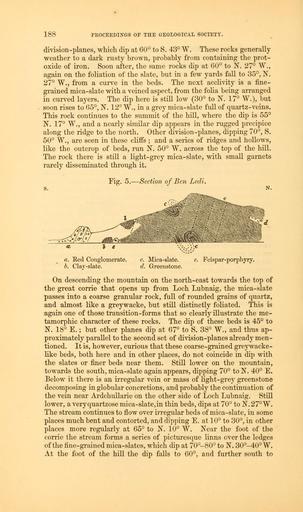 | Keywords: The Quarterly journal of the Geological Society of London (12645725615).jpg 188 <br> PKOCEEDLNTGS OF THE GEOLOGICAL SOCIETY <br> division -planes which dip at 60° to S 43° W These rocks generally <br> weather to a dark rusty brown probably from containing the prot- <br> oxide of iron Soon after the same rocks dip at 60° to N 27° W <br> again on the foliation of the slate but in a few yards fall to 35° N <br> 27° W from a curve in the beds The next acclivity is a fine- <br> grained mica-slate with a veined aspect from the folia being arranged <br> in curved layers The dip here is still low 30° to N 17° W but <br> soon rises to 65° N 12° W in a grey mica-slate full of quartz-veins <br> This rock continues to the summit of the hill where the dip is 55° <br> N 17° W and a nearly similar dip appears in the rugged precipice <br> along the ridge to the north Other division-planes dipping 70° S <br> 50° W are seen in these cliffs ; and a series of ridges and hollows <br> like the outcrop of beds run N 50° W across the top of the hill <br> The rock there is still a light-grey mica-slate with small garnets <br> rarely disseminated through it <br> s <br> Fig 5 ” Section of Ben Lecli <br> e <br> a Red Conglomerate <br> b Clay-slate <br> ; \ \c <br> c Mica-slate <br> d Greenstone <br> e Felspar-porphyry <br> On descending the mountain on the north-east towards the top of <br> the great corrie that opens up from Loch Lubnaig the mica-slate <br> passes into a coarse granular rock full of rounded grains of quartz <br> and almost like a greywacke but still distinctly foliated This is <br> again one of those transition-forms that so clearly illustrate the me- <br> tamorphic character of these rocks The dip of these beds is 45° to <br> N 18° E ; but other planes dip at 67° to S 38° W and thus ap- <br> proximately parallel to the second set of division-planes already men- <br> tioned It is however curious that these coarse-grained greywaeke- <br> like beds both here and in other places do not coincide in dip with <br> the slates or finer beds near them Still lower on the mountain <br> towards the south mica-slate again appears dipping 70° to N 40° E <br> Below it there is an irregular vein or mass of light-grey greenstone <br> decomposing in globular concretions and probably the continuation of <br> the vein near Ardchullarie on the other side of Loch Lubnaig Still <br> lower a veryquartzose mica-slate in thin beds dips at 70° to N 27°W <br> The stream continues to flow over irregular beds of mica-slate in some <br> places much bent and contorted and dipping E at 10° to 30° in other <br> places more regularly at 65° to N 10° W Near the foot of the <br> corrie the stream forms a series of picturesque linns over the ledges <br> of the fine-grained mica-slates which dip at 70°-80° to N 30°-40° W <br> At the foot of the hill the dip falls to 60° and further south to 35328149 109632 51125 Page 188 Text v 19 http //www biodiversitylibrary org/page/35328149 1863 Geological Society of London Biodiversity Heritage Library The Quarterly journal of the Geological Society of London v 19 1863 Geology Periodicals Smithsonian Libraries bhl page 35328149 dc identifier http //biodiversitylibrary org/page/35328149 smithsonian libraries Information field Flickr posted date ISOdate 2014-02-20 Check categories 2015 August 26 CC-BY-2 0 BioDivLibrary https //flickr com/photos/61021753 N02/12645725615 2015-08-27 10 59 25 cc-by-2 0 PD-old-70-1923 The Quarterly journal of the Geological Society of London 1863 Photos uploaded from Flickr by Fæ using a script |