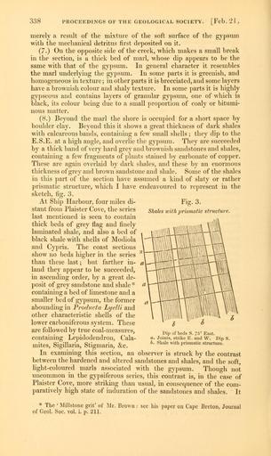| Keywords: The Quarterly journal of the Geological Society of London (12645195185).jpg 338 <br> PROCEEDINGS OF THE GEOLOGICAL SOCIETY Feb 21 <br> merely a result of the mixture of the soft surface of the gypsum <br> with the mechanical detritus first deposited ou it <br> 7 On the opposite side of the creek which makes a small break <br> in the section is a thick bed of marl whose dip appears to be the <br> same with that of the gypsum In general character it resembles <br> the marl underlying the gypsum In some parts it is greenish and <br> homogeneous in texture ; in other parts it is brecciated and some layers <br> haA'e a brownish colour and shaly texture In some parts it is highly <br> gypseous and contains layers of granular gypsum one of which is <br> black its colour being due to a small proportion of coaly or bitumi- <br> nous matter <br> 8 Beyond the marl the shore is occupied for a short space by <br> boulder clay Beyond this it shows a great thickness of dark shales <br> with calcareous bands containing a few small shells ; they dip to the <br> E S E at a high angle and overlie the gypsum They are succeeded <br> by a thick band of very hard grey and brownish sandstones and shales <br> containing a few fragments of plants stained by carbonate of copper <br> These are again overlaid by dark shales and these by an enormous <br> thickness of grey and brown sandstone and shale Some of the shales <br> in this part of the section have assumed a kind of slaty or rather <br> prismatic structure which I have endeavoured to represent in the <br> Fig 3 <br> Shales with prismatic structure <br> sketch fig 3 <br> At Ship Harbour four miles di- <br> stant from Plaister Cove the series <br> last mentioned is seen to contain <br> thick beds of grey flag and finely <br> laminated shale and also a bed of <br> black shale with shells of Modiola <br> and Cypris The coast sections <br> show no beds higher in the series <br> than these last; but farther in- <br> land they appear to be succeeded <br> m ascending order by a great de- <br> posit of grey sandstone and shale <br> containing a bed of limestone and a <br> smaller bed of gypsum the former <br> abounding in Prodiicta Lyelli and <br> other characteristic shells of the <br> lower carboniferous system These <br> are followed by true coal-measures <br> containing Lepidodendron Cala- <br> mites Sigillaria Stigmaria c <br> In examining this section an observer is struck by the contrast <br> between the hardened and altered sandstones and shales and the soft <br> light-coloured marls associated with the gypsum Though not <br> uncommon in the gypsiferous series this contrast is in the case of <br> Plaister Cove more striking than usual in consequence of the com- <br> paratively high state of induration of the sandstones and shales It <br> The ' Millstone grit' of Mr Brown see his paper on Cape Breton Jouinal <br> of Geol Soc vol i p 211 <br> Dip of beds S 5° East <br> a Joints strike E and W Dip S <br> b Shale with prismatic structure 35268988 109512 51125 Page 338 Text v 5 http //www biodiversitylibrary org/page/35268988 1849 Geological Society of London NameFound Cypris NameConfirmed Cypris EOLID 14512 NameBankID 2698202 NameFound Lepidodendron NameConfirmed Lepidodendron EOLID 13132167 NameBankID 4921583 NameFound Lyelli NameConfirmed Lyelli NameBankID 3415658 NameFound Modiola NameConfirmed Modiola EOLID 71417 NameBankID 2647821 NameFound Shales NameFound Sigillaria NameConfirmed Sigillaria EOLID 13132168 NameBankID 4343184 NameFound Stigmaria NameConfirmed Stigmaria EOLID 6133541 NameBankID 4853119 Biodiversity Heritage Library The Quarterly journal of the Geological Society of London v 5 1849 Geology Periodicals Smithsonian Libraries bhl page 35268988 dc identifier http //biodiversitylibrary org/page/35268988 smithsonian libraries Information field Flickr posted date ISOdate 2014-02-20 Check categories 2015 August 26 CC-BY-2 0 BioDivLibrary https //flickr com/photos/61021753 N02/12645195185 2015-08-27 10 52 05 cc-by-2 0 PD-old-70-1923 The Quarterly journal of the Geological Society of London 1849 Photos uploaded from Flickr by Fæ using a script |