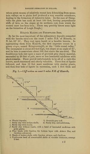 | Keywords: The Quarterly journal of the Geological Society of London (13889764988).jpg BASALTIC FORMATIOX IN ICELAND 95 <br> where great masses of relatively receat lava debouching from moun- <br> tain valleys on to plains had produced a very sejisible subsidence <br> leading to the formation of extensive lakes In the case of Thing- <br> valla the plain has sunk at least iOJ feet leaving perpendicular <br> cliffs of lava on the slopes at its northern eud from which the <br> central mass has been torn These may possibly throw some light <br> on the formation of Lough Neagh J <br> HusAViK Marine and Freshwater Beds <br> By far the most important of the sedimentary deposits connected <br> with the basalts occurs on the coast 7 miles N E of Husavik in <br> N lat jQ 10' They rest upon basalt or a basaltic breccia In <br> approaching them ffom Husavik the first exposure occurs in a <br> grassy cirque named Hringvershujlft or the little round valley <br> The escarpment is about 260 feet high but slopes at an angle of 45° <br> and its base is somewhere about 100 feet above the sea-level The <br> fossiliferous beds rest upoa a mass of greenish grey clayey material <br> succeeded by 20 feet of pale more or less laminated sandstone with <br> plant-remains These proved unfortunately to be all of a rush-like <br> nature much macerated and utterly valueless Three feet of lignite <br> followed and then 10 feet more sandstone with similar plants <br> and then four beds of lignite in succession each 1 foot thick and <br> Pig 1 ” Cliff-section on coast 9 miles N E of HusaviTc <br> a Glacial deposits h Greenish-grey tuff <br> c Sandy clay with broken shells d Sandy clay unfossiliferous <br> e Sandy clay with fossils <br> / Sandy clay without fossils with a band of laminated sandstone with <br> green grains <br> g Four bands with Cyprina the bottom layer with Actceon Noce and <br> Cardium echinatum <br> h Bands of broken shells with Cypri/ia Actceon and Cardium <br> i Continuous band of comminuted shells of variable thickness average <br> 2 feet <br> i2 37046933 114009 51125 Page 95 Text 41 http //www biodiversitylibrary org/page/37046933 1885 Geological Society of London NameFound Cardium NameConfirmed Cardium EOLID 50301 NameBankID 2693257 NameFound Cardium echinatum NameConfirmed Cardium echinatum EOLID 448785 NameBankID 511516 NameFound Cyprina NameConfirmed Cyprina NameBankID 4132765 Biodiversity Heritage Library The Quarterly journal of the Geological Society of London v 41 1885 Geology Periodicals Smithsonian Libraries bhl page 37046933 dc identifier http //biodiversitylibrary org/page/37046933 smithsonian libraries Information field Flickr posted date ISOdate 2014-04-30 Check categories 2015 August 26 CC-BY-2 0 BioDivLibrary https //flickr com/photos/61021753 N02/13889764988 2015-08-26 04 58 51 cc-by-2 0 PD-old-70-1923 The Quarterly journal of the Geological Society of London 1885 Photos uploaded from Flickr by Fæ using a script |