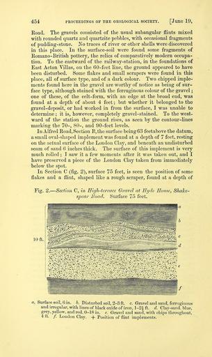 Keywords: The Quarterly journal of the Geological Society of London (12513123963).jpg 454 <br> PROCEEDINGS OF THE GEOLOGICAL SOCIETY June 19 <br> Road The gravels consisted of the usual subangular flints mixed <br> with rounded quartz and quartzite pebbles with occasional fragments <br> of pudding-stone No traces of river or other shells were discovered <br> in this place In the surface-soil were found some fragments of <br> Romano-British pottery the relics of comparatively modern occupa- <br> tion To the eastward of the railway-station in the foundations of <br> East Acton ViUas on the 60-feet line the ground appeared to have <br> been disturbed Some flakes and small scrapers were found in this <br> place all of surface type and of a dark colour Two chipped imple- <br> ments found here in the gravel are worthy of notice as being of sur- <br> face type although stained with the ferruginous colour of the gravel ; <br> one of these of the celt-form with an edge at the broad end was <br> found at a depth of about 4 feet ; but whether it belonged to the <br> gravel-deposit or had worked in from the surface I was unable to <br> determine ; it is however completely gravel -stained To the west- <br> ward of the station the ground rises as seen by the contour-lines <br> marking the 70- 80- and 90-feet levels <br> In Alfred Road Section B the surface being 63 feetabove the datum <br> a small oval-shaped implement was found at a depth of 7 feet resting <br> on the actual surface of the London Clay and beneath an undisturbed <br> seam of sand 6 inches thick The surface of this implement is very <br> much rolled ; T saw it a few moments after it was taken out and I <br> have preserved a piece of the London Clay taken from immediately <br> below the spot <br> In Section C fig 2 surface 75 feet is seen the position of some <br> flakes and a flint shaped like a rough scraper found at a depth of <br> Fig 2 ” Section C in High-terrace Gravel at Hyde House Shalce- <br> sjjear I oad Surface 75 feet <br> 10 ft <br> a Surface soil 6 in b Disturbed soil 2-3 ft c Gravel and sand ferruginous <br> and irregular with lines of black oxide of iron 1-2 ft d Clay-sand blue <br> grey yellow and red 0-18 in e Gravel and sand with chips' throughout <br> 4 ft / London Clay - - Position of flint implements 34985505 108770 51125 Page 454 Text v 28 http //www biodiversitylibrary org/page/34985505 1872 Geological Society of London Biodiversity Heritage Library The Quarterly journal of the Geological Society of London v 28 1872 Geology Periodicals Smithsonian Libraries bhl page 34985505 dc identifier http //biodiversitylibrary org/page/34985505 smithsonian libraries Information field Flickr posted date ISOdate 2014-02-14 Check categories 2015 August 26 CC-BY-2 0 BioDivLibrary https //flickr com/photos/61021753 N02/12513123963 2015-08-27 10 00 11 cc-by-2 0 PD-old-70-1923 The Quarterly journal of the Geological Society of London 1872 Photos uploaded from Flickr by Fæ using a script