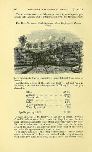 | Keywords: The Quarterly journal of the Geological Society of London (12512997943).jpg 312 <br> PROCEEDINGS OF THE GEOLOGICAL SOCIETY April 24 <br> The exception occurs at Brisbane where a dyke of quartz por- <br> phyrite cuts through and is interstratified with the Mesozoic strata <br> Fig 19 ” Horizontal Cocd-Measures cut hy Trap-dyTces Pelican <br> Creek <br> there developed ; but its character is quite different from those of <br> Group 1 <br> At Gladstone a dyke of the only true trachyte yet met with in <br> the colony is quarried for building-stone PI XL fig 1 Its analysis <br> afforded me <br> SiHca 67-800 <br> Alumina 14-666 <br> Perric oxide 5-350 <br> Potash 5-653 <br> Soda 4-600 <br> Water constitution 0-700 <br> Water hygroscopic 0-600 <br> Specific gravity 2-320 99-369 <br> This rock resembles the trachyte of the Puy-de-Dome Crystals <br> of sanidin felspar occur in a crystalline felspathic base the iron <br> being in finely disseminated scales of iron-glance throughout the mass <br> No mineral veins occur in or near it It traverses the Devonian <br> series of the district ; and although there is no proof of its relative <br> age it has the appearance of a modern rock <br> The active influence of these trap disturbances of various periods <br> seems in Queensland to have been confined to the strip of country <br> lying about 200 miles back from and parallel to the eastern coast 34985325 108770 51125 Page 312 Text v 28 http //www biodiversitylibrary org/page/34985325 1872 Geological Society of London Biodiversity Heritage Library The Quarterly journal of the Geological Society of London v 28 1872 Geology Periodicals Smithsonian Libraries bhl page 34985325 dc identifier http //biodiversitylibrary org/page/34985325 smithsonian libraries Information field Flickr posted date ISOdate 2014-02-14 Check categories 2015 August 26 CC-BY-2 0 BioDivLibrary https //flickr com/photos/61021753 N02/12512997943 2015-08-27 10 01 24 cc-by-2 0 PD-old-70-1923 The Quarterly journal of the Geological Society of London 1872 Photos uploaded from Flickr by Fæ using a script |
