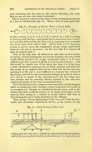Keywords: The Quarterly journal of the Geological Society of London (12512912173).jpg 264 <br> PROCEEDINGS OF THE GEOLOGICAL SOCIETY April 10 <br> wave returning into the mass in the reverse direction ; but with <br> that we are not here very much concerned <br> This is rendered evident to the senses by the analogous movements <br> of a line of billiard balls fig 3 When a line of such equal balls <br> Pig 3 ” Transfer of Elastic Wave in Ivory Balls <br> in close contact 1 2 3 4 5 6 7 B is struck by a ball A moving <br> in directum with the line each elastic ball in succession from A and 1 <br> to 7 and B is deformed by the blow and in regaining form transmits <br> the elastic wave from ball to ball All the balls 1 to 7 however ˘ <br> remain at rest in space the transmitted energy being equilibrated <br> between each pair in succession ; but the last ball B is thrown off <br> from its contact with 7 <br> Now if the balls were all adherent to each other at their points <br> of contact instead of being free and merely touching the same result <br> would follow provided the energy transmitted from 7 to B were <br> sufficient not only to move it off but to overcome the adhesion And <br> this would be equally true if the whole line from 1 to B had been <br> a solid cylindrical or prismatic bar of elastic material provided that <br> the energy of any impulse delivered by a blow into the bar and com- <br> pressing it at the end 1 were sufficient to overcome the cohesion of <br> the elastic material in some cross section through the point of contact <br> of 7 and B or nearer to the extremity at B the bar being thus <br> torn asunder and its extremity thrown forward by the otherwise <br> unbalanced energy of the wave accumulated there <br> Now this illustrates in a common-sense way what actually happens <br> when an earthquake-wave having a nearly horizontal wave-path or <br> an emergent one through an extended horizontal mass such as the <br> Cachar clay -beds suddenly arrives at an abrupt termination of the <br> mass by their ending in a vertical or nearly vertical cliff such as <br> that forming the river-banks described by Dr Oldham <br> Thus let fig 4 be an ideal section of the river-bed with the low- <br> water and wet-season water-levels shown ; g the masses of clay <br> Fig 4 ” Ideal Section of Biver-hed <br> resting upon the ooze-bed o and this on subjacent incoherent strata s; <br> and let the wave-path of shock be in the direction Tc to I and of m to s 34985273 108770 51125 Page 264 Text v 28 http //www biodiversitylibrary org/page/34985273 1872 Geological Society of London Biodiversity Heritage Library The Quarterly journal of the Geological Society of London v 28 1872 Geology Periodicals Smithsonian Libraries bhl page 34985273 dc identifier http //biodiversitylibrary org/page/34985273 smithsonian libraries Information field Flickr posted date ISOdate 2014-02-14 Check categories 2015 August 26 CC-BY-2 0 BioDivLibrary https //flickr com/photos/61021753 N02/12512912173 2015-08-27 10 02 41 cc-by-2 0 PD-old-70-1923 The Quarterly journal of the Geological Society of London 1872 Photos uploaded from Flickr by Fæ using a script |