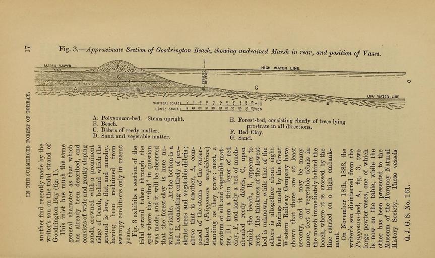 | Keywords: The Quarterly journal of the Geological Society of London (14076823654).jpg IN THE SUBMERGED FOREST OF TORBAT <br> 17 <br> another find recentl ' made by the <br> writer's son on the tidal strand of <br> Goodrington Bay fig 1 <br> This inlet has much the same <br> general character as that which <br> has already been described and <br> consists of wide and gently sloping <br> sands crowned with a prominent <br> ridge of beach behind which the <br> ground is low flat and marshy <br> having been reclaimed from <br> swampy conditions only in recent <br> years <br> Fig 3 exhibits a section of the <br> tidal strand taken through the <br> spot where the find in question <br> was made and it will be observed <br> that the forest-clay is here no- <br> where visible At the bottom is a <br> bed E consisting entirely of pro- <br> strate trees and vegetable debris ; <br> above that is another A com- <br> posed of the stems of the water- <br> bistort Polygonum amphihium <br> standing as they grew ; next a <br> stratum of silt and vegetable mat- <br> ter D ; then a thin layer of red <br> clay P and lastly a bed of much- <br> abraded reedy debris C upon <br> which the beach B appears to <br> rest The thickness of the lowest <br> bed is unknown while that of the <br> others is altogether about eight <br> feet Borings made by the Great <br> Western Eailway Company have <br> shown that there are at least <br> seventy and it may be many <br> more feet of vegetable debris in <br> the marsh immediately behind the <br> beach where it is crossed by the <br> line carried on a high embank- <br> ment <br> On November 18th 1883 the <br> writer's son disinterred from the <br> Polygonum-'hed A fig 3 two <br> large pewter vases one of which <br> is now on the table while the <br> other has been presented to the <br> Museum of the Torquay N atural <br> History Societ These vessels <br> Q J G S No 161 37046815 114009 51125 Page 17 Text 41 http //www biodiversitylibrary org/page/37046815 1885 Geological Society of London NameFound Polygonum NameConfirmed Polygonum EOLID 38335 NameBankID 2646993 Biodiversity Heritage Library The Quarterly journal of the Geological Society of London v 41 1885 Geology Periodicals Smithsonian Libraries bhl page 37046815 dc identifier http //biodiversitylibrary org/page/37046815 smithsonian libraries Information field Flickr posted date ISOdate 2014-04-30 Check categories 2015 August 26 CC-BY-2 0 BioDivLibrary https //flickr com/photos/61021753 N02/14076823654 2015-08-26 04 57 26 cc-by-2 0 PD-old-70-1923 The Quarterly journal of the Geological Society of London 1885 Photos uploaded from Flickr by Fæ using a script |