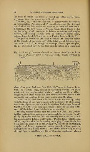 | Keywords: The Quarterly journal of the Geological Society of London (14076822634).jpg 12 <br> D PIDGEOX ON EECENT DISCOTEEIES <br> the clays in which the forest is rooted are either coeval with <br> or younger than the bronze age in Britain <br> The map fig 1 exhibits that part of Torbay which is occupied <br> by Goodrington Paignton and Preston Sands upon the first and <br> last of which the finds which are about to be described were made <br> Eeferring in the first place to Preston Sands these fringe a fiat <br> marshy valley which excavated in Triassic sandstones and conglo- <br> merates and falling seaward with an extremely gentle slope <br> extends from Redclifi'e Towers at A to Preston Lane at B fig 1 <br> The gales of December 1883 and Pebruary 1884 stripped nearly <br> all the shingle off the upper half of the tidal strand between these <br> two points A B exposing the outcrops shown upon the plan <br> fig 2 The forest-clay K was then seen to extend in a continuous <br> Pig 2 ” Plaii of Outcrops ohserved on Preston Sands A to B on <br> fig 1 December 1883 to February 1884 Scale 340 feet to <br> 1 inch <br> sheet of no great thickness from Redclifi'e Towers to Preston Lane <br> while its seaward edge instead of extending beyond low-water <br> mark as in the neighbouring inlets of Goodiington Torre Abbey <br> Paignton and Broad Sands has been truncated by the action of the <br> sea and is now confined to the limits shown upon the plan <br> Inland the clay bed forms a flat basin whose northern lip rising <br> with the fiank of the valley thins out to nothing at B about seven <br> feet above high-water mark while its southern lip has been denuded <br> together vrith the Trias rock upon which it rests to the level of the <br> sea Of the inland lip of this basin more hereafter <br> The clay reposes directly upon the Trias at A figs 1 2 while <br> further north it lies upon a somewhat remarkable breccia or head <br> L fig 2 which caps the Trias conformably from about the point C <br> for a considerable distance northwards of Preston Lane This breccia <br> which together with the forest- clay underlying Preston Sands has <br> been minutely described by Mr Pengelly consists of unstratified <br> angular and loosely aggregated stones packed without order or <br> arrangement in a clayey matrix The stones have nearly all been <br> derived from a neighbouring hill of Devonian sandstone whence <br> Trans Dev Assoc for 1878 37046852 114009 51125 Page 12 Text 41 http //www biodiversitylibrary org/page/37046852 1885 Geological Society of London Biodiversity Heritage Library The Quarterly journal of the Geological Society of London v 41 1885 Geology Periodicals Smithsonian Libraries bhl page 37046852 dc identifier http //biodiversitylibrary org/page/37046852 smithsonian libraries Information field Flickr posted date ISOdate 2014-04-30 Check categories 2015 August 26 CC-BY-2 0 BioDivLibrary https //flickr com/photos/61021753 N02/14076822634 2015-08-26 04 57 28 cc-by-2 0 PD-old-70-1923 The Quarterly journal of the Geological Society of London 1885 Photos uploaded from Flickr by Fæ using a script |