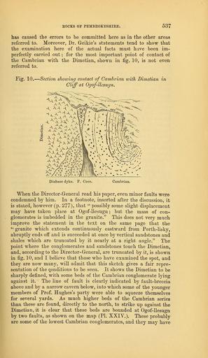 | Keywords: The Quarterly journal of the Geological Society of London (13889239499).jpg ROCKS or PEMBROKESHIRE <br> 537 <br> has caused the errors to be committed here as in the other areas <br> referred to Moreover Dr Geikie's statements tend to show that <br> the examination here of the actual facts must have been im- <br> perfectly carried out ; for the most important point of contact of <br> the Cambrian with the Dimetian shown in fig 10 is not even <br> referred to <br> Fig 10 ” Section slioiving contact of Cambrian with Dimetian in <br> Cliff at Ogof-Uesugn <br> Diabase dyke F Cave <br> Cambrian <br> When the Director-General read his paper even minor faults were <br> condemned by him In a footnote inserted after the discussion it <br> is stated however p 277 that possibly some slight displacement <br> may have taken place at Ogof-llesugn ; but the mass of con- <br> glomerates is imbedded in the granite This does not very much <br> improve the statement in the text on the same page that the <br> granite which extends continuously eastward from Porth-lisky <br> abruptly ends off and is succeeded at once by vertical sandstones and <br> shales which are truncated by it nearly at a right angle The <br> point where the conglomerates and sandstones touch the Dimetian <br> and according to the Director-General are truncated by it is shown <br> in fig 10 and I believe that those who have examined the spot and <br> they are now many will admit that this sketch gives a fair repre- <br> sentation of the Qonditions to be seen It shows the Dimetian to be <br> sharply defined with some beds of the Cambrian conglomerate lying <br> against it The line of fault is clearly indicated by fault-breccia <br> above and by a narrow cavern below into which some of the younger <br> members of Prof Hughes's party were able to squeeze themselves <br> for several yards As much higher beds of the Cambrian series <br> than these are found directly to the north to strike up against the <br> Dimetian it is clear that these beds are bounded at Ogof-llesugn <br> by two faults as shown on the map PI XXIY These probably <br> are some of the lowest Cambrian conglomerates and they may have 36941370 113697 51125 Page 537 Text 40 http //www biodiversitylibrary org/page/36941370 1884 Geological Society of London Biodiversity Heritage Library The Quarterly journal of the Geological Society of London v 40 1884 Geology Periodicals Smithsonian Libraries bhl page 36941370 dc identifier http //biodiversitylibrary org/page/36941370 smithsonian libraries Information field Flickr posted date ISOdate 2014-04-30 Check categories 2015 August 26 CC-BY-2 0 BioDivLibrary https //flickr com/photos/61021753 N02/13889239499 2015-08-26 05 53 11 cc-by-2 0 PD-old-70-1923 The Quarterly journal of the Geological Society of London 1884 Photos uploaded from Flickr by Fæ using a script |