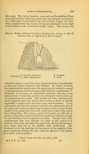 | Keywords: The Quarterly journal of the Geological Society of London (14052746146).jpg ROCKS OF PEMBEOKESHIRE <br> 525 <br> this coast The latter however occur only at Pen-pleidiau Point <br> between Caerbwdy and Caerfai where they are tolerably fossilifcrous <br> In a cliff-section immediately to the S E of Nun's Chapel the Cam- <br> brian conglomerates may be seen resting unconformably on the edges <br> of the Pebidian rocks as is shown in figs 1 and 2 This section was <br> Fig 2 ” Section sliowing Camhrian Conglomerate resting on edge of <br> Pebidian beds in Cliff S E of Nwi's Chaj el <br> Cambrian <br> 2 Greenish sandstones <br> 1 Basal conglomerate <br> B Pebidian <br> F Fault <br> referred to by me in a previous paper as proving marked unconformity <br> in this area between Cambrian and Pebidian Dr Geikie however <br> has endeavoured to explain away this appearance by calling it a case of <br> ' contemporaneous erosion accompanying Cambrian conglomerates <br> Evidently on his theory of conformable succession this was a very <br> awkward case to deal with and the only alternative was to call it one <br> of contemporaneous erosion This section and some adjoining ones <br> when examined with care clearly show however that it is utterly <br> impossible to explain away the facts on any such hypothesis It is a <br> curious fact also that this section is stated in the explanatory text of <br> his paper and in that accompanying the figure itself to be in Caerfai <br> whilst it is in reality more than half a mile west of that creek and in <br> Nun's Chapel Bay The section as given in his paper at p 287 also is <br> clearly an imperfect representation of the conditions exhibited though <br> the unconformity can be recognized even there Though some of the <br> conglomerates have been dropped by a fault in this section it is <br> fortunate that it has only taken the upper beds and has left the lower <br> ones where they rest on the Pebidian beds undisturbed The <br> thickness lost by the fault has not been great as the majority of the <br> green sandstones forming the next series are present in the section <br> in a nearly vertical position <br> Quart Journ Geol Soc vol xxxix p 287 <br> Q J G S No 159 2u 36941358 113697 51125 Page 525 Text 40 http //www biodiversitylibrary org/page/36941358 1884 Geological Society of London Biodiversity Heritage Library The Quarterly journal of the Geological Society of London v 40 1884 Geology Periodicals Smithsonian Libraries bhl page 36941358 dc identifier http //biodiversitylibrary org/page/36941358 smithsonian libraries Information field Flickr posted date ISOdate 2014-04-30 Check categories 2015 August 26 CC-BY-2 0 BioDivLibrary https //flickr com/photos/61021753 N02/14052746146 2015-08-26 05 54 02 cc-by-2 0 PD-old-70-1923 The Quarterly journal of the Geological Society of London 1884 Photos uploaded from Flickr by Fæ using a script |