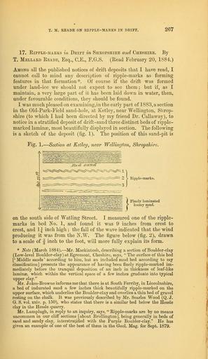 | Keywords: The Quarterly journal of the Geological Society of London (13889200108).jpg of ripple-marks as forming <br> features in that formation Of course if the drift was formed <br> under land-ice we should not expect to see them; but if as I <br> maintain a very large part of it has been laid down in water then <br> under favourable conditions they should be found <br> I was much pleased on examining in the early part of 1883 a section <br> in the Old-Park-Pield sand-hole at Ketley near Wellington Shrop- <br> shire to which I had been directed by my friend Dr Callaway to <br> notice in a stratified deposit of drift-sand three distinct beds of ripple- <br> marked laminae most beautifully displayed in section The following <br> is a sketch of the deposit fig 1 The position of this sand-pit is <br> Eig 1 ” Section at Ketley near Wellington Shrojpshire <br> ' r rt f ' ' ' ' ~- -- -_ - Vi ˘' r ~ - I Finely laminated <br> -~ 7 - r ' - - - - - - '- i loamy sand <br> on the south side of Watling Street I measured one of the ripple- <br> marks in bed No 1 and found it was 9 inches from crest to <br> crest and 1 inch high ; the fall of the Avave indicated that the wind <br> producing it was from the N W The figure below fig 2 drawn <br> to a scale of inch to the foot will more fully explain its form <br> Note March 1884 ” Mr Mackintosb describing a section of Boulder-clay <br> Low-level Boulder-clay at Egremont Cheshire says The surface of this bed <br> ' Middle sands ' according to him but an included sand bed according to my <br> classification presents the appearance of haA'ing been finely ripple-marked im- <br> mediately before the tranquil deposition of an inch in thickness of leaf-like <br> laminÂŁe which within the vertical space of a few inches graduate into typical <br> upper clay <br> Mr Jukes-Browne informs me that there is at South Ferriby in Lincolnshire <br> a bed of indurated sand a few inches thick beautifully ripple-marked on the <br> upper surface which underlies the Boulder-clay and overlies a thin bed of gravel <br> resting on the chalk It was previously described by Mr Searles Wood Q J <br> G S vol xxiv p 150 who states that there is a similar bed below the Hessle <br> clay in the Hessle quarry <br> Mr Lamplugh in reply to an inquiry says Eipple-marks are by no means <br> uncommon in our clifi sections about Bridlington being generally in beds of <br> sand and sandy clay interstratified with the Purple Boulder-clay He has <br> given an example of one of the best of them in the Geol Mag for Sept 1879 36941056 113697 51125 Page 267 Text 40 http //www biodiversitylibrary org/page/36941056 1884 Geological Society of London Biodiversity Heritage Library The Quarterly journal of the Geological Society of London v 40 1884 Geology Periodicals Smithsonian Libraries bhl page 36941056 dc identifier http //biodiversitylibrary org/page/36941056 smithsonian libraries Information field Flickr posted date ISOdate 2014-04-30 Check categories 2015 August 26 CC-BY-2 0 BioDivLibrary https //flickr com/photos/61021753 N02/13889200108 2015-08-26 05 57 01 cc-by-2 0 PD-old-70-1923 The Quarterly journal of the Geological Society of London 1884 Photos uploaded from Flickr by Fæ using a script |